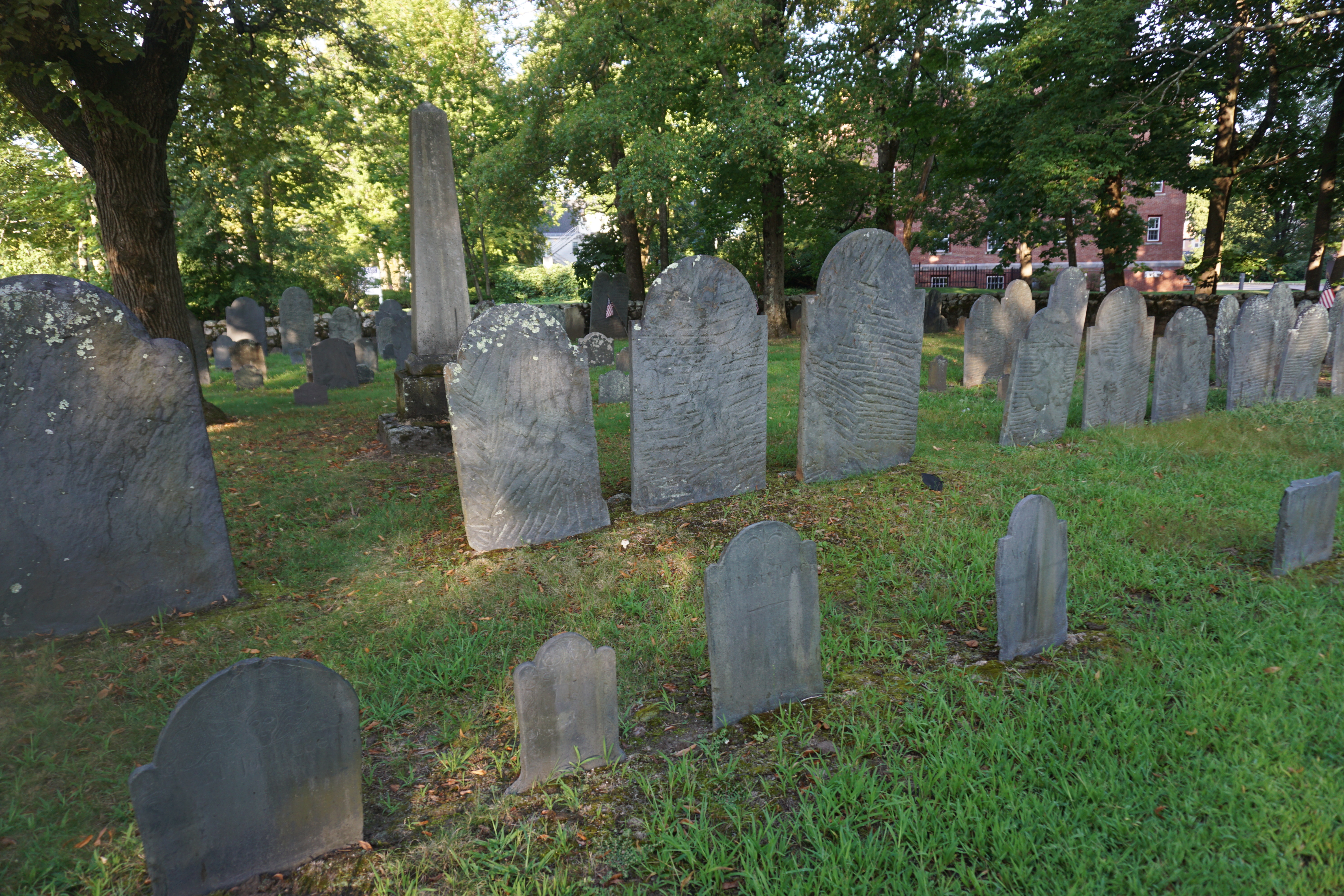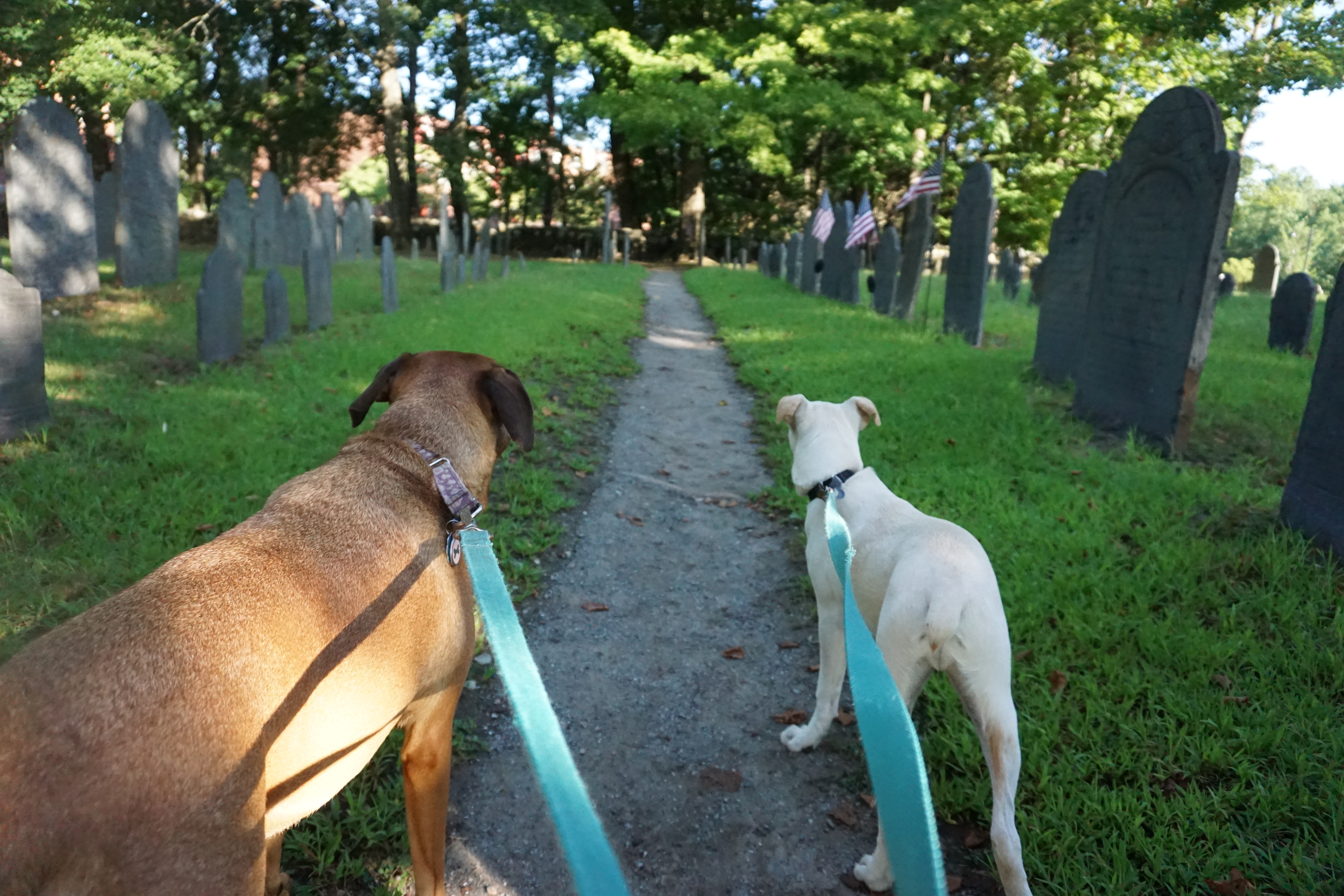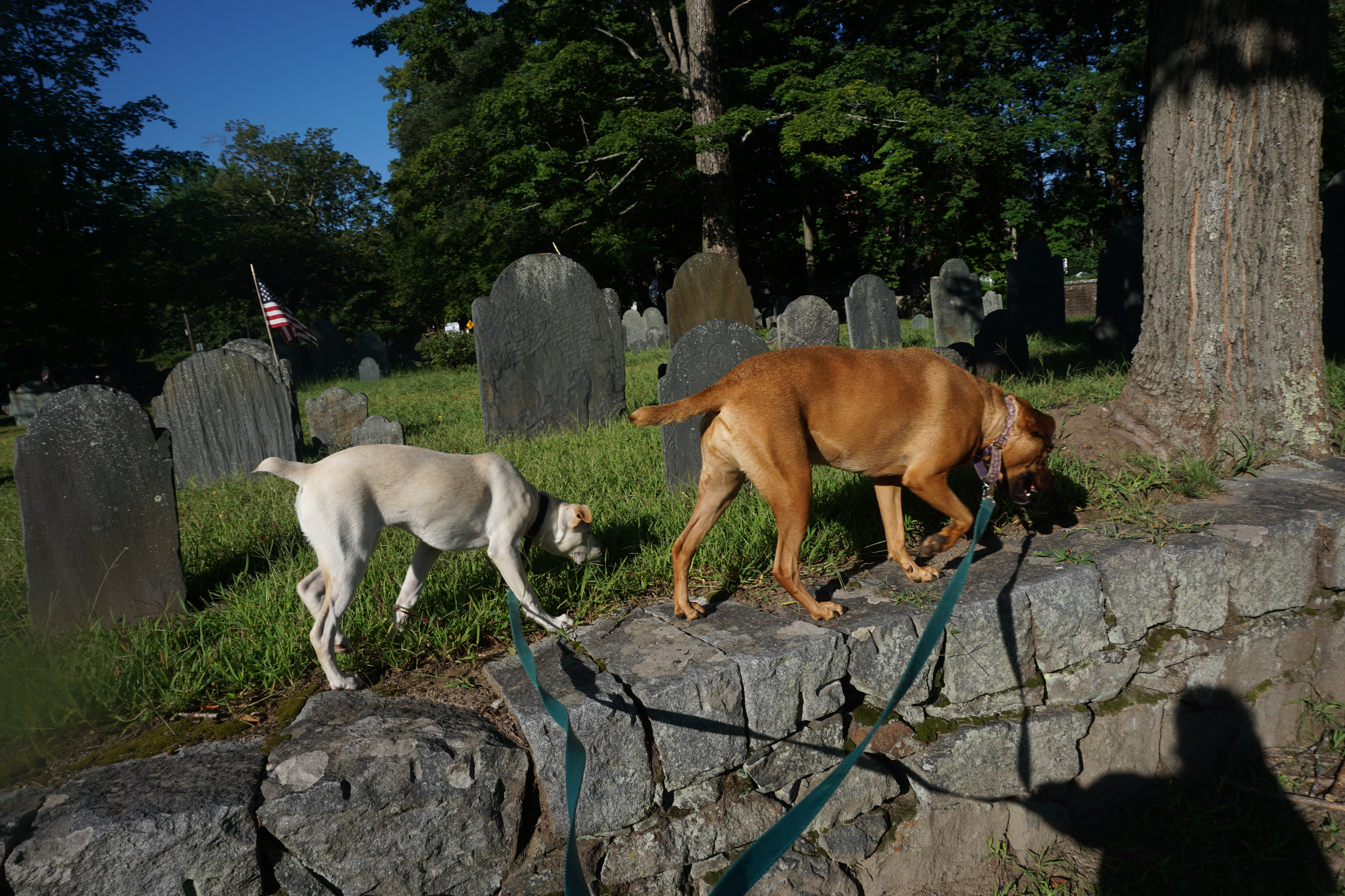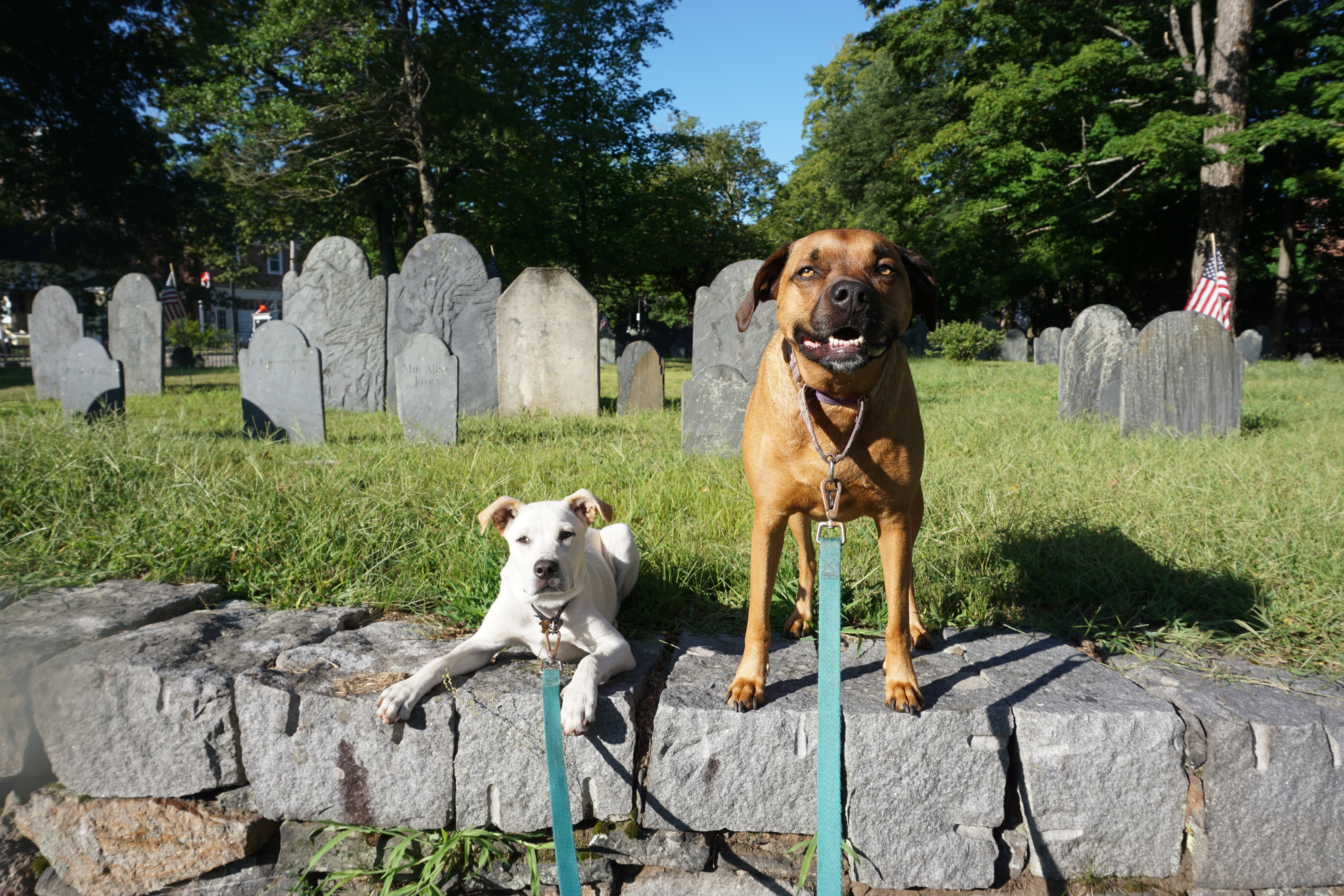 We had a history filled Adventure to Concord, Massachusetts. During our visit we explored a variety of locations including: Wrights Tavern, Monument Square, and the Old Burial Ground. We arrived bright and early, preventing a crowded scene. We walked down the main street stopping at various spots and enjoying the architecture of the buildings. Wilma was especially pleased that it was a cooler morning, not being too enthused with the recent heat. Both Wilma and Gus trotted along, and posed perfectly. My favorite landmark was the Old Burial Ground and enjoyed searching for various highlights along the way. So glad we could wander around Concord today (This blog will not be rated).