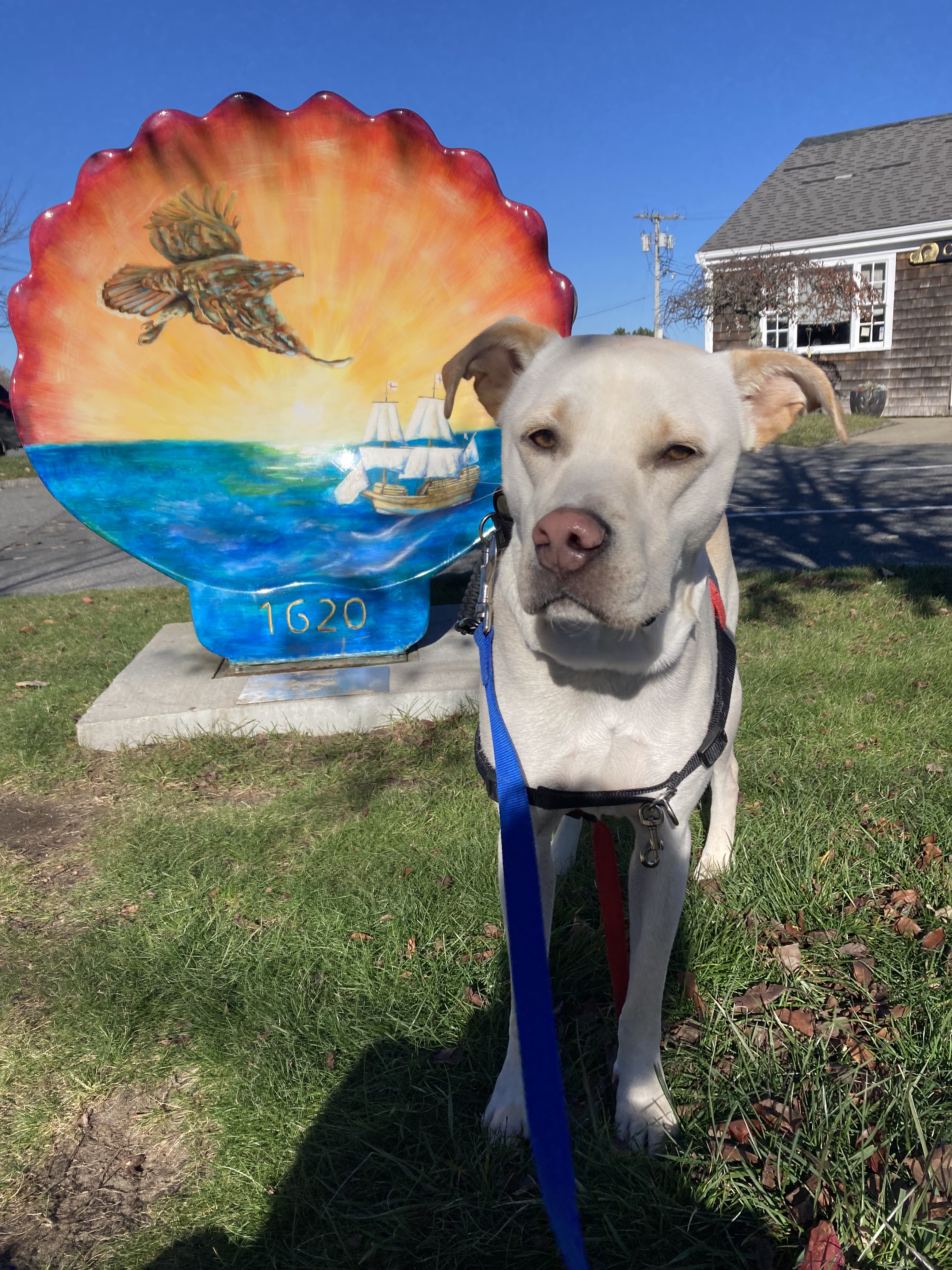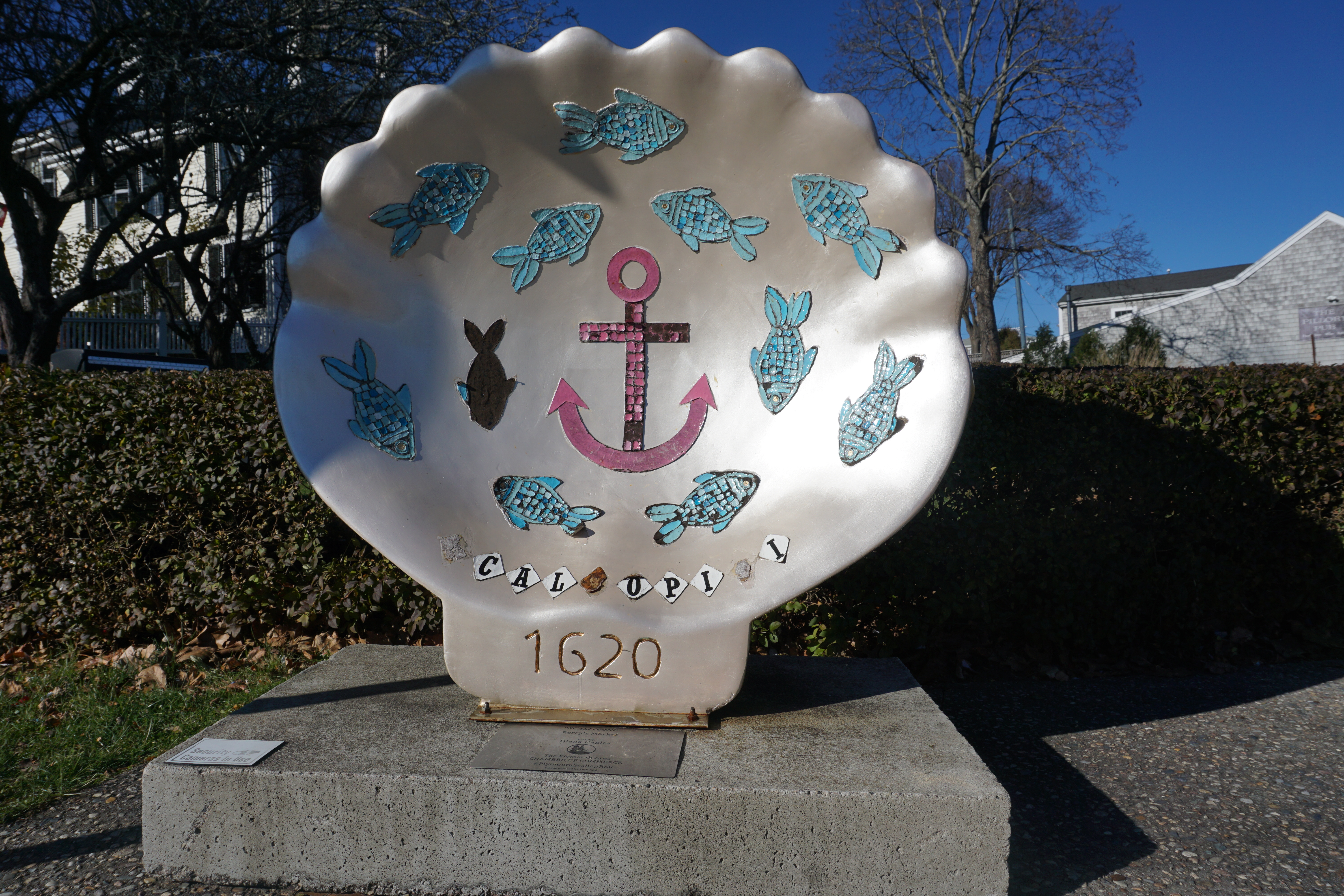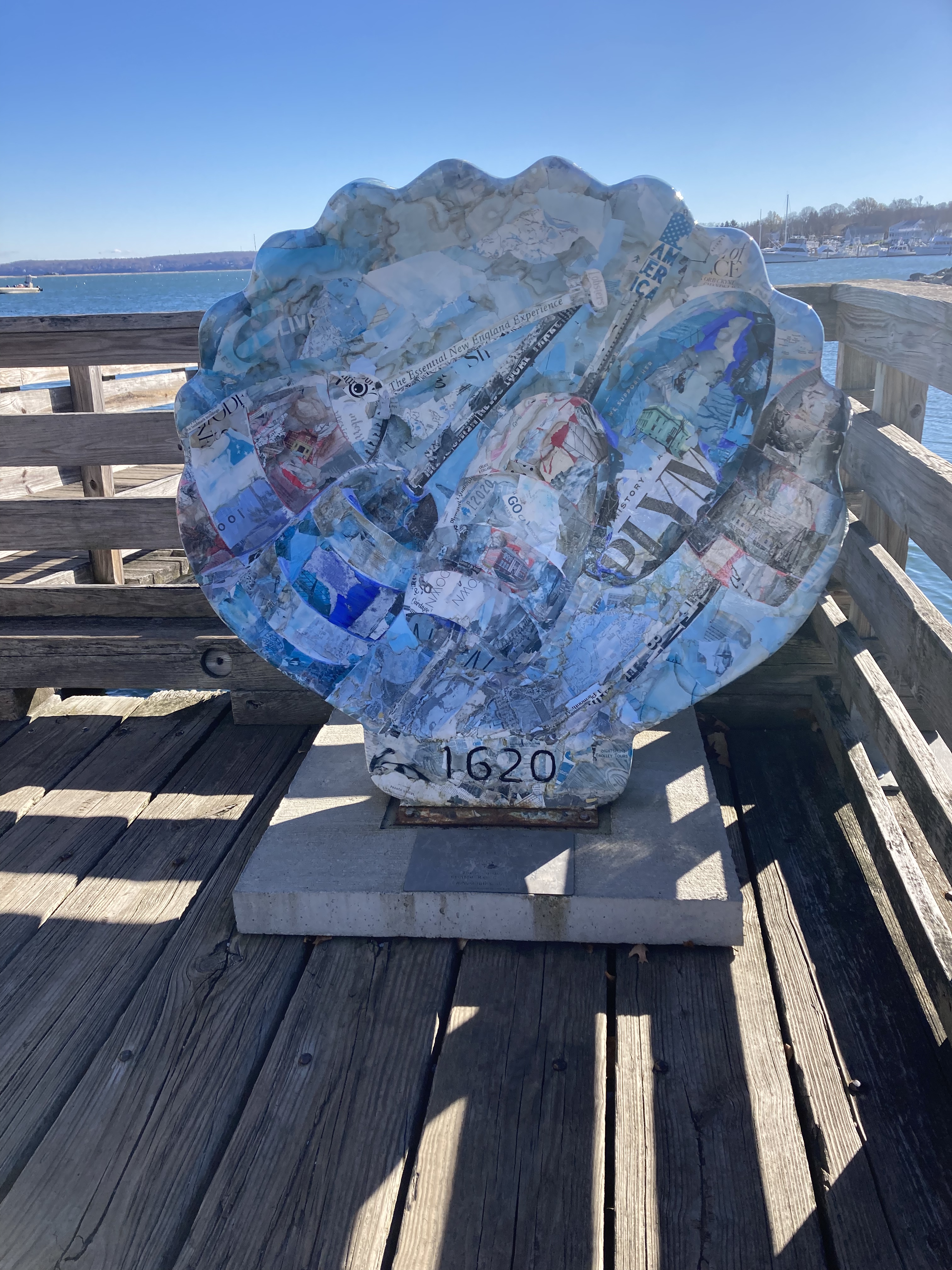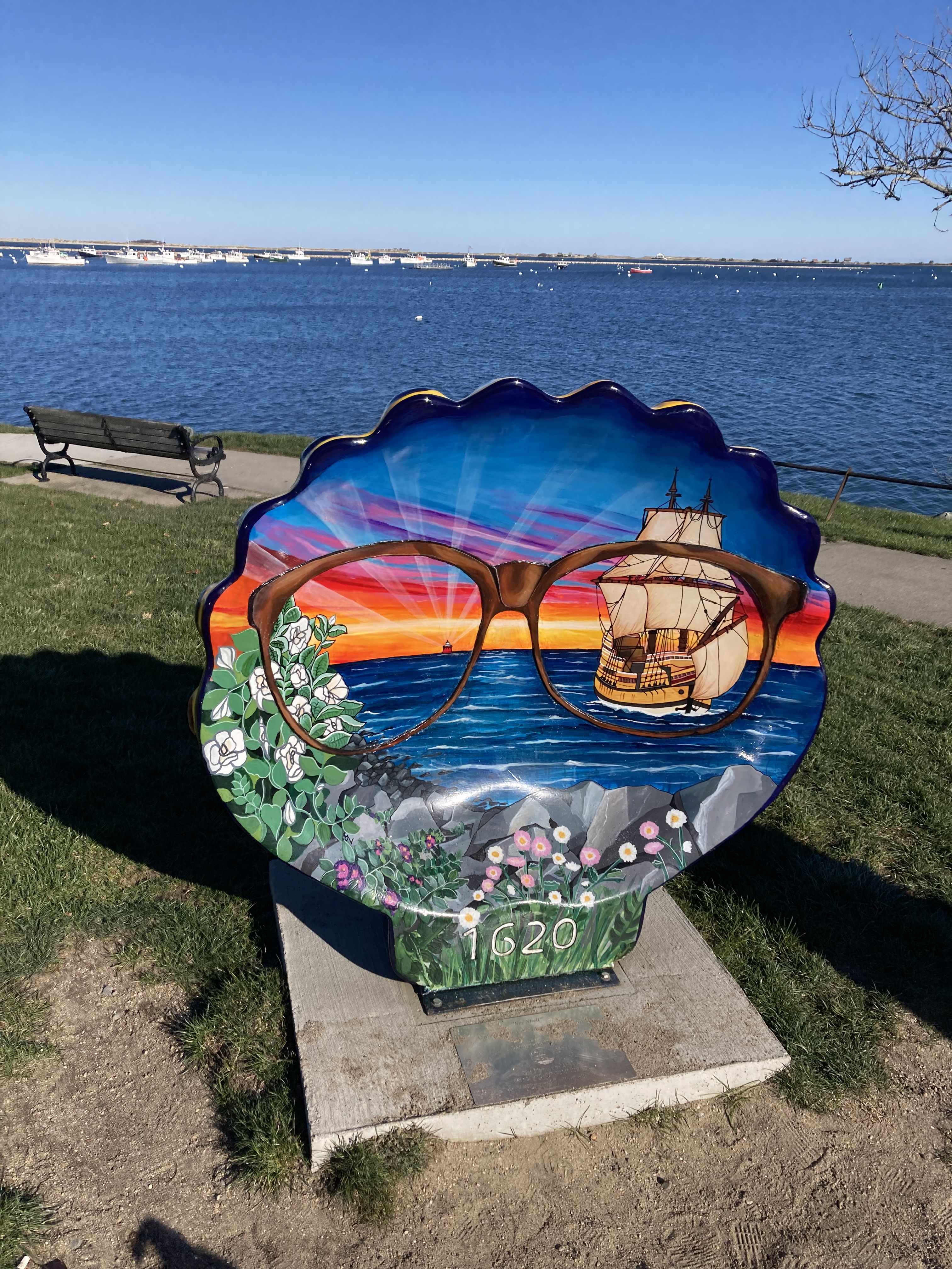 Today Wilma, Gus, and I Adventured to the beautiful town of Plymouth, Massachusetts. We spent three hours walking this lovely coastal town. Plymouth is a coastal town in southern Massachusetts. It is famous for the history of being the first Pilgrim settlement in 1620. Since I have blogged about Plymouth before, yet still was inspired to share I thought I would blog about the Public Art Display of the Scallop Shells. These works of art are displayed throughout the waterfront and downtown Plymouth. They have been created from fiberglass and crafted from local artists.