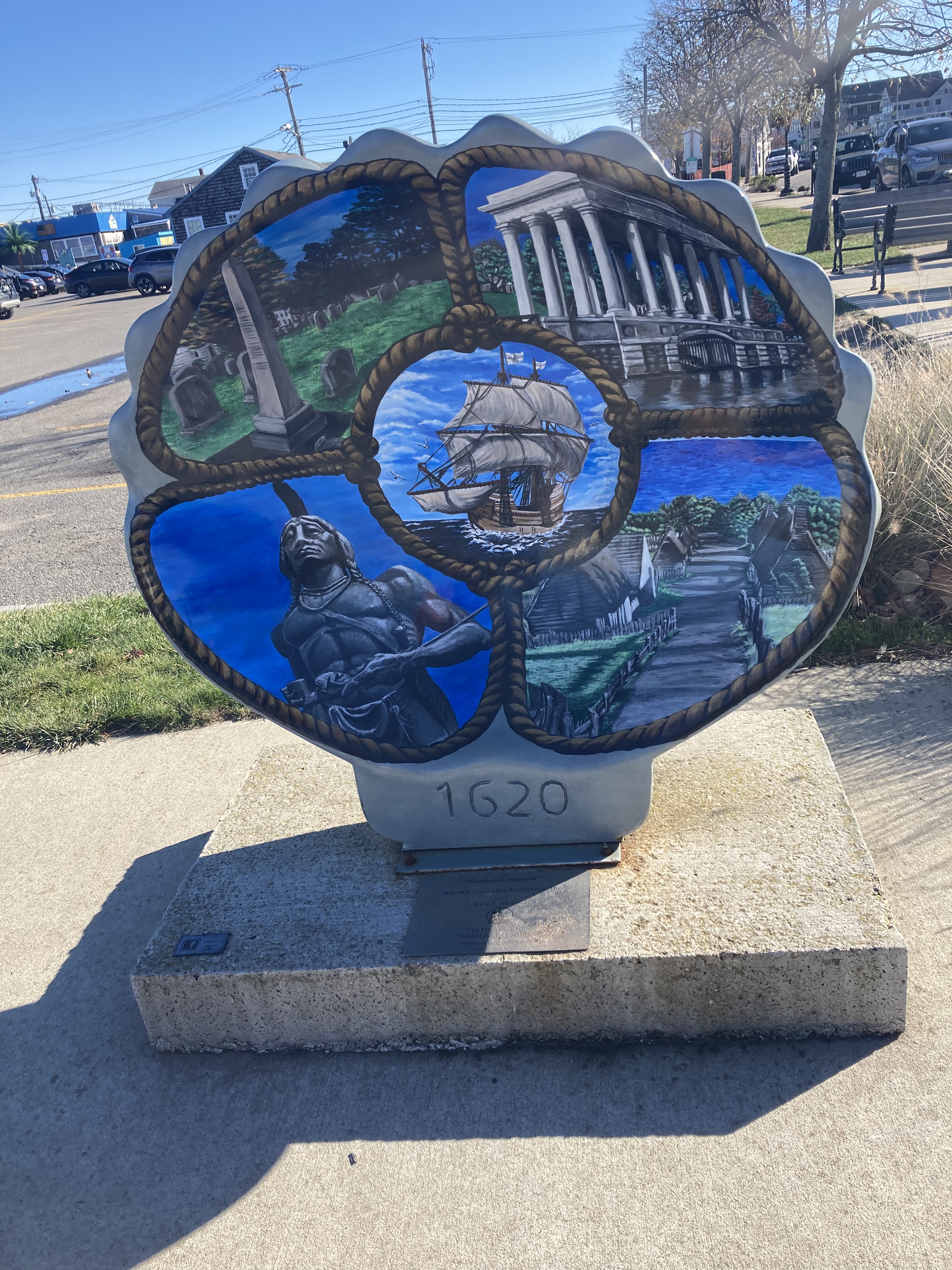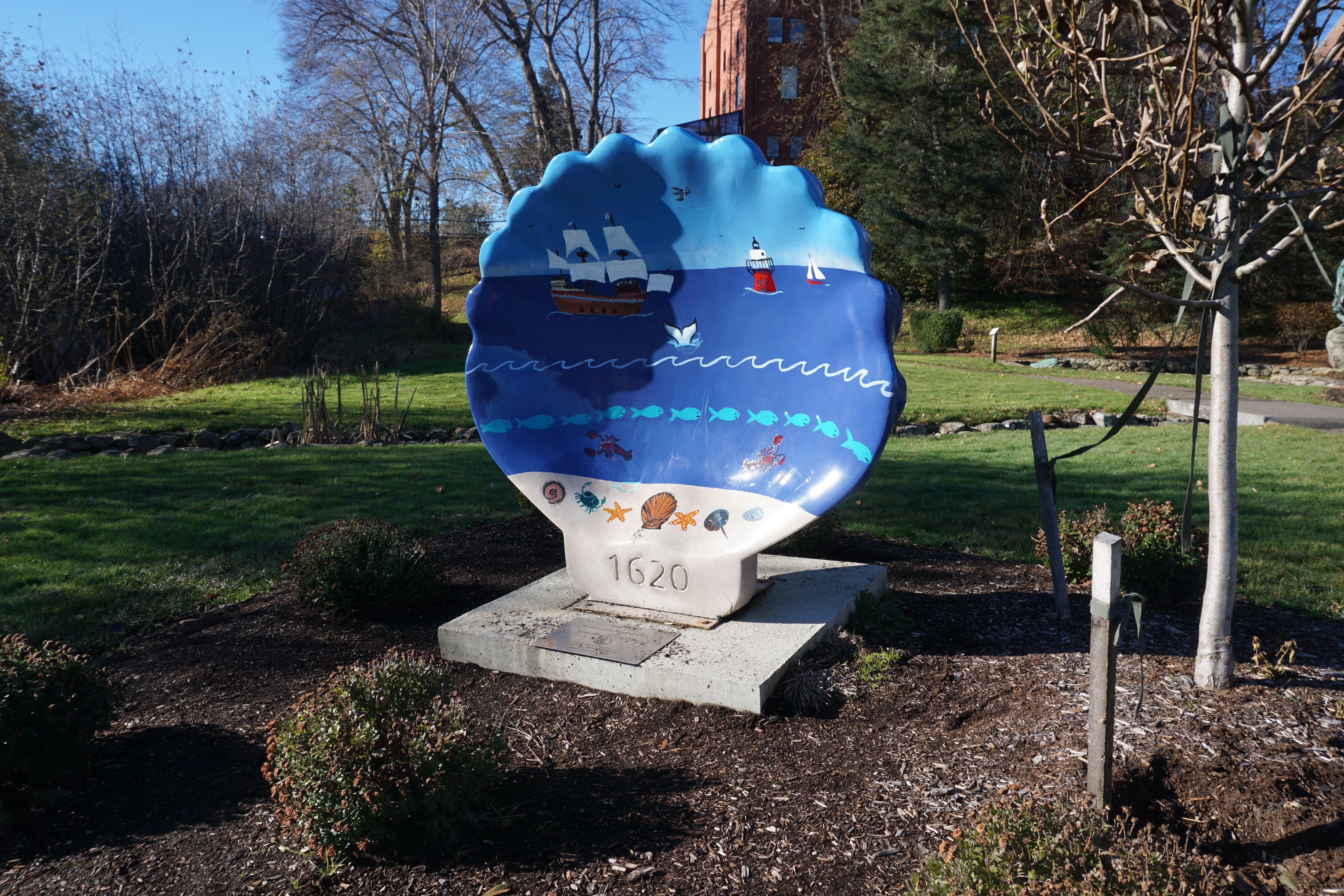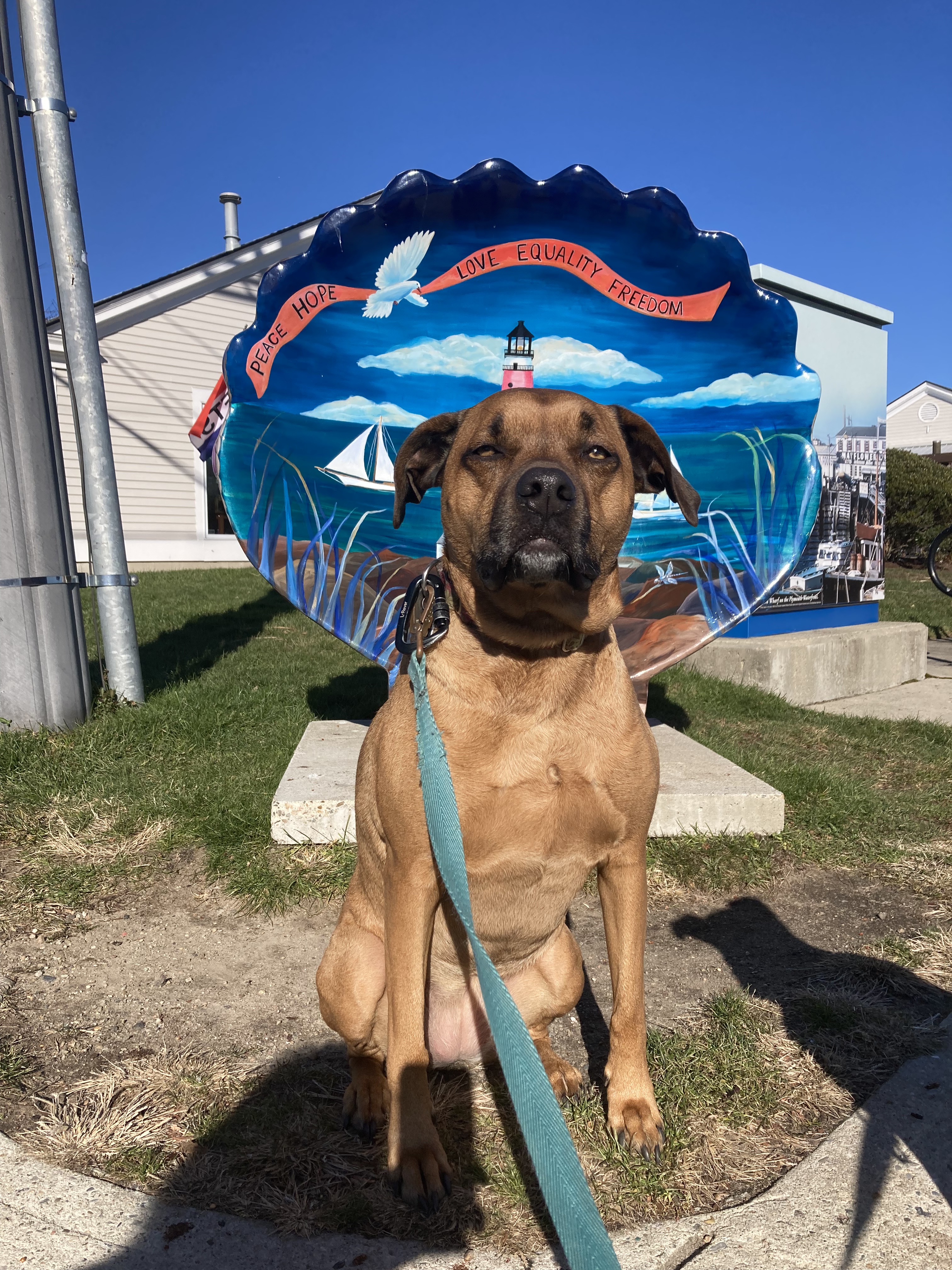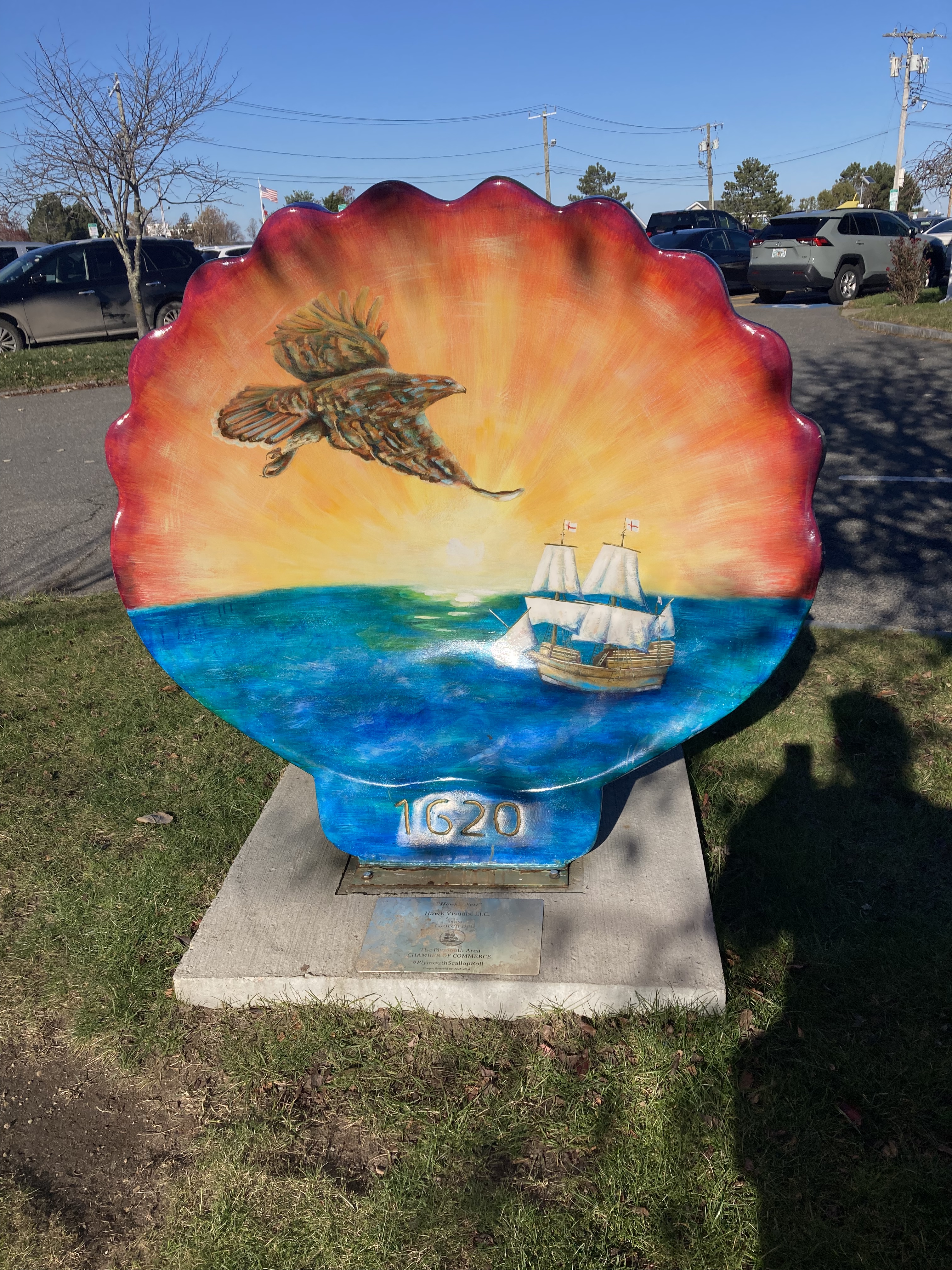 Today Wilma, Gus, and I Adventured to the beautiful town of Plymouth, Massachusetts. We spent three hours walking this lovely coastal town. Plymouth is a coastal town in southern Massachusetts. It is famous for the history of being the first Pilgrim settlement in 1620. Since I have blogged about Plymouth before, yet still was inspired to share I thought I would blog about the Public Art Display of the Scallop Shells. These works of art are displayed throughout the waterfront and downtown Plymouth. They have been created from fiberglass and crafted from local artists.