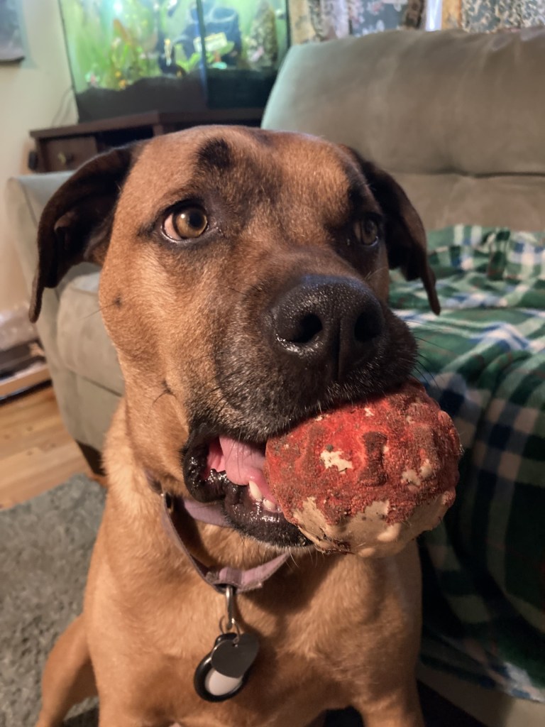 Today’s photo is a photo of Wilma with one of her favorite balls, which has received a lot of love. This is a very cheap ball so every so often I buy her a new one, and she squeaks it as her heart desires. I sometimes have bought two, but she does not want to share (haha!) However, Gus definitely has moments where he enjoys the ball, or steals from her for kicks (haha)! I am happy to say she is feeling much better and wanting to play ball… Here she is: