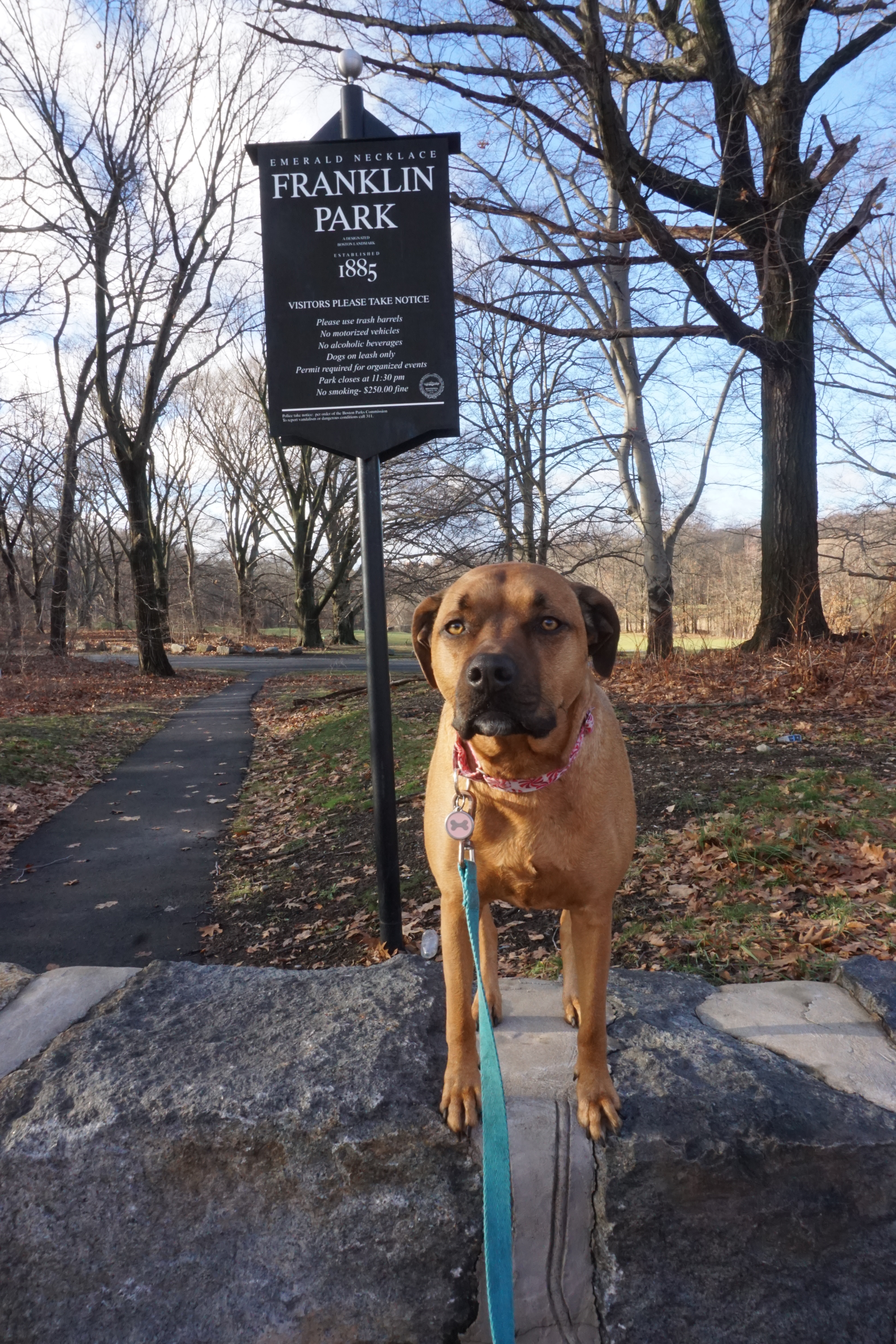 Today Wilma and I Adventured to Franklin Park in Boston, Massachusetts. Franklin Park is the largest park in the Emerald Necklace at approximately 527 acres. It was designed by Frederick Law Olmsted in the 1890s. Franklin Park includes: trails, history, a public golf course, Schoolmaster Hill and the ruins, Scarboro Pond, and the Franklin Park Zoo.