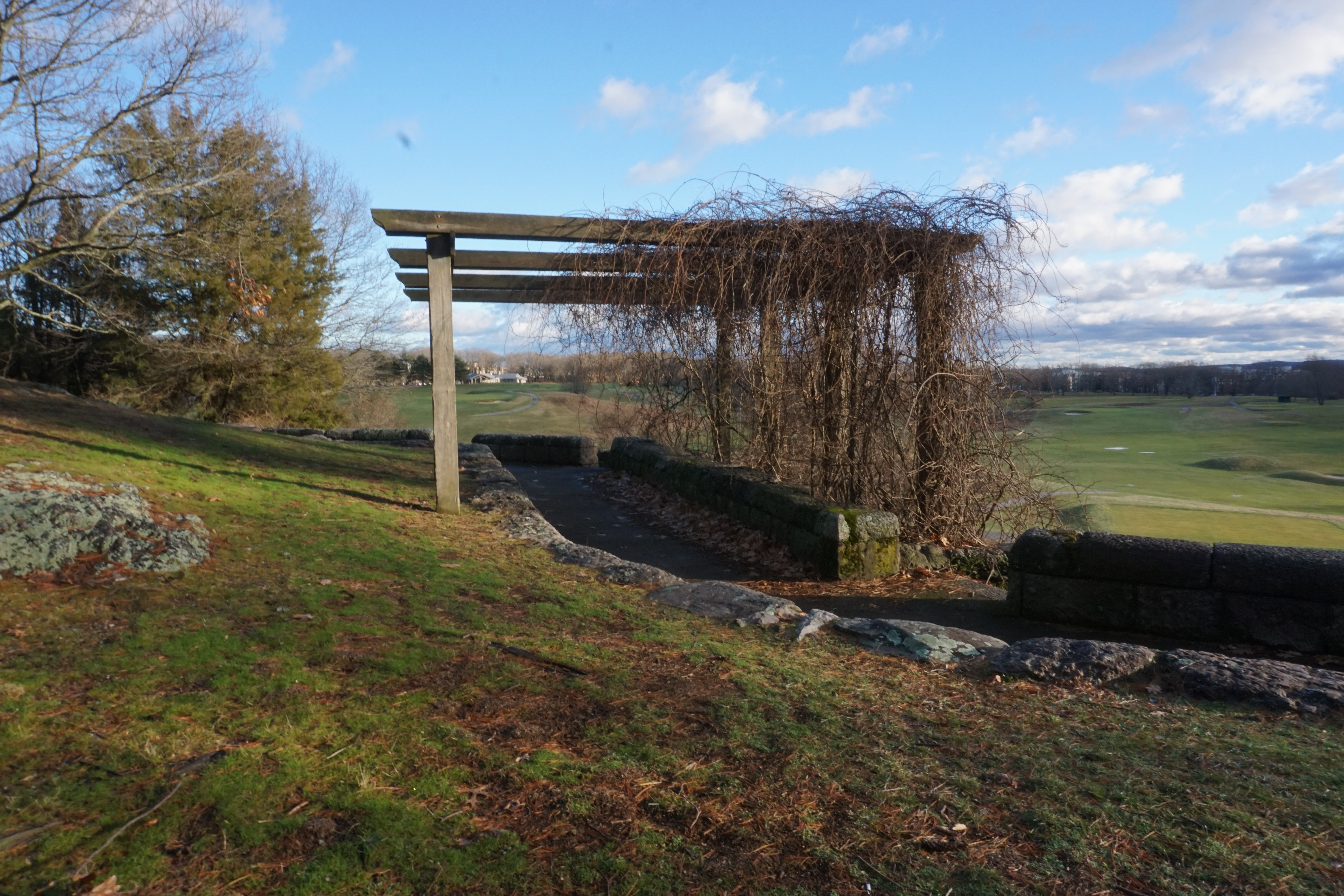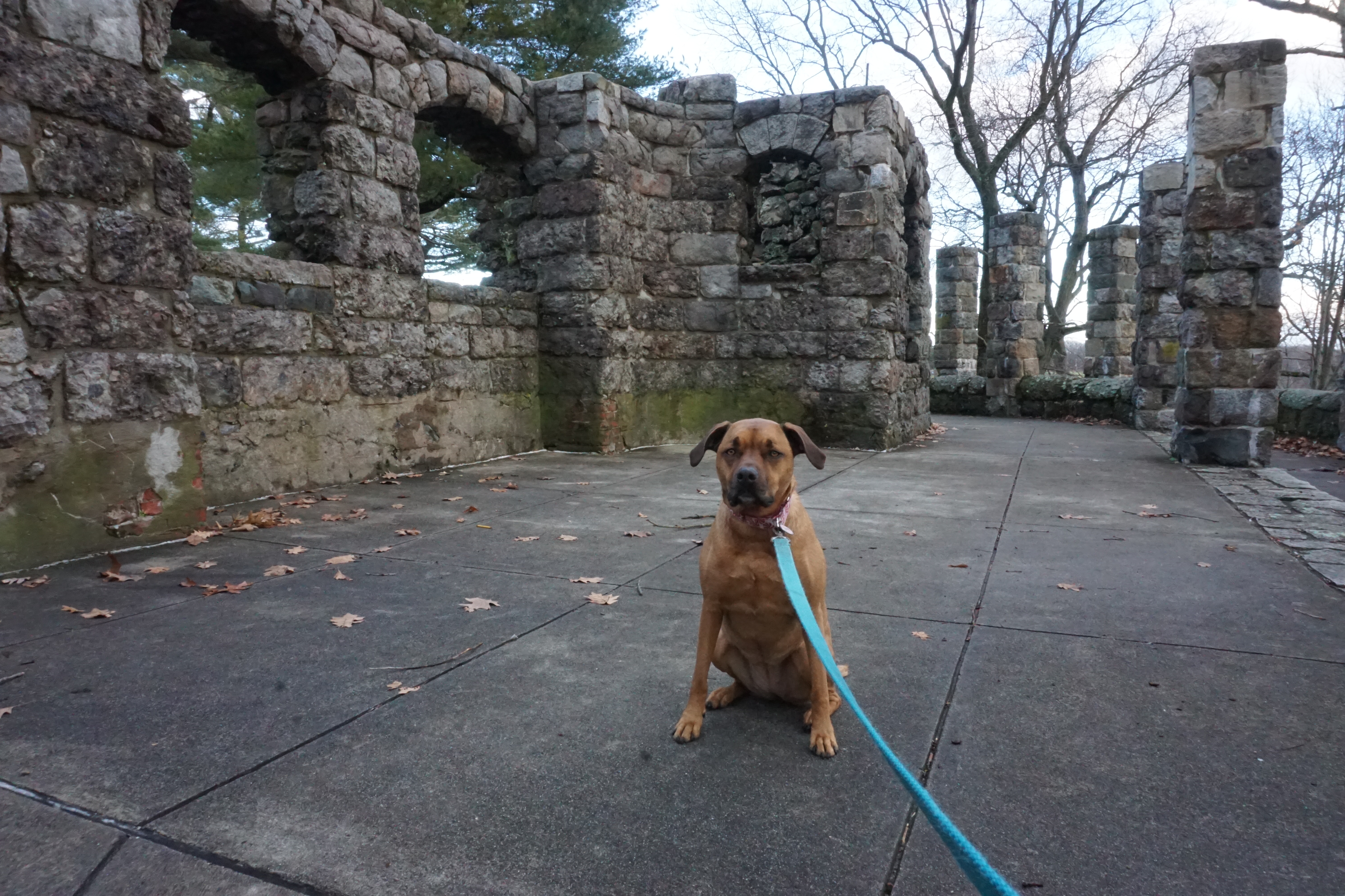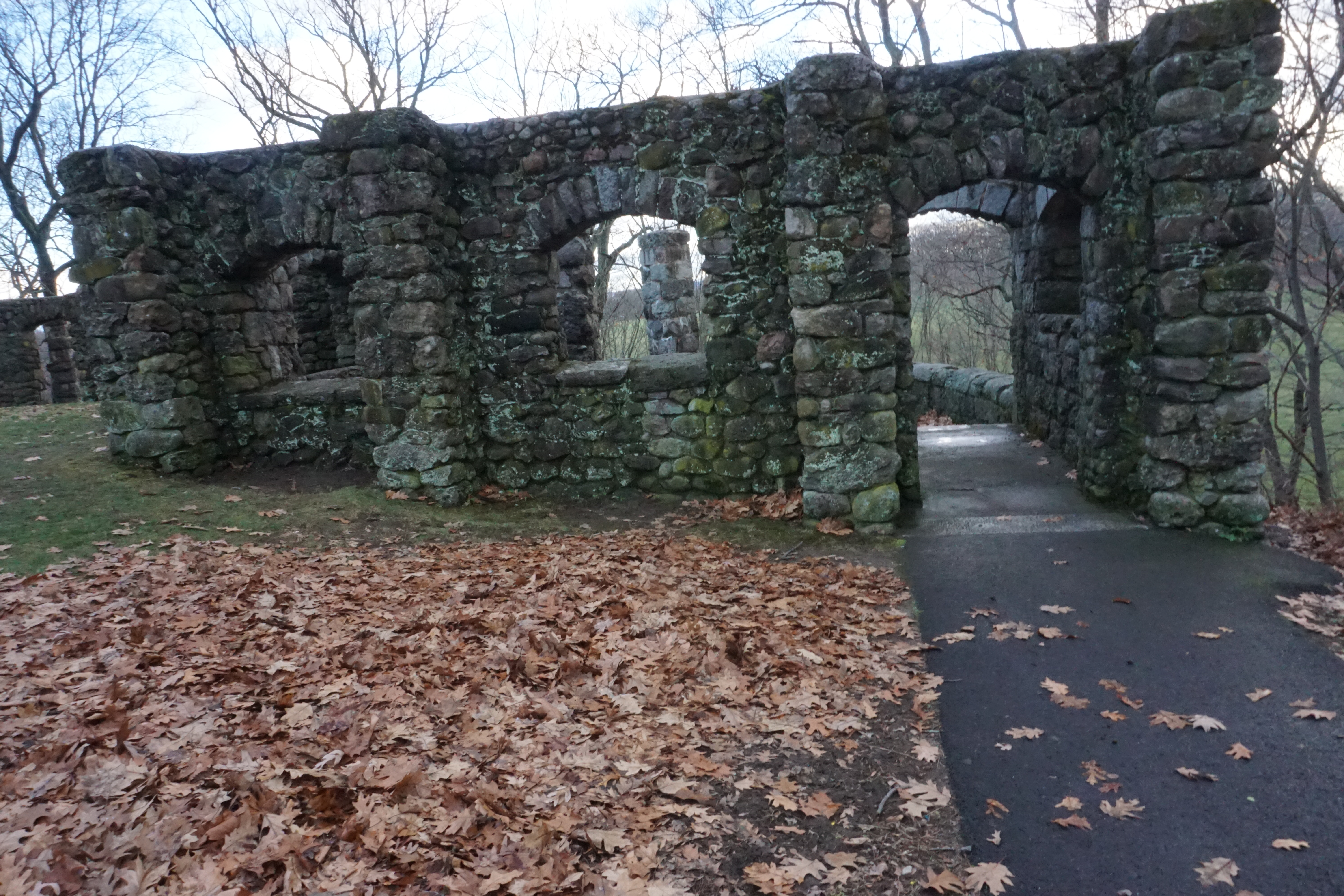 After Scarboro Pond we headed on the main loop around the Park. The Park was centered by the golf course, and the clouds and sun were just right. We passed various things including a playground and cafe before arriving at the Schoolmaster Hill. I was so excited to head up the Hill to check out the ruins. We arrived at the ruins after a short walk up the Hill, trotting through the ruins several times, appreciating each moment of the experience. Wilma appeared extra curious, jumping up, putting her front paws up to look through, and peaking into each corner. I absolutely loved the ruins, they were beautiful. Definitely exceeded my expectations! (Please see below for a video as well as numerous photographs).