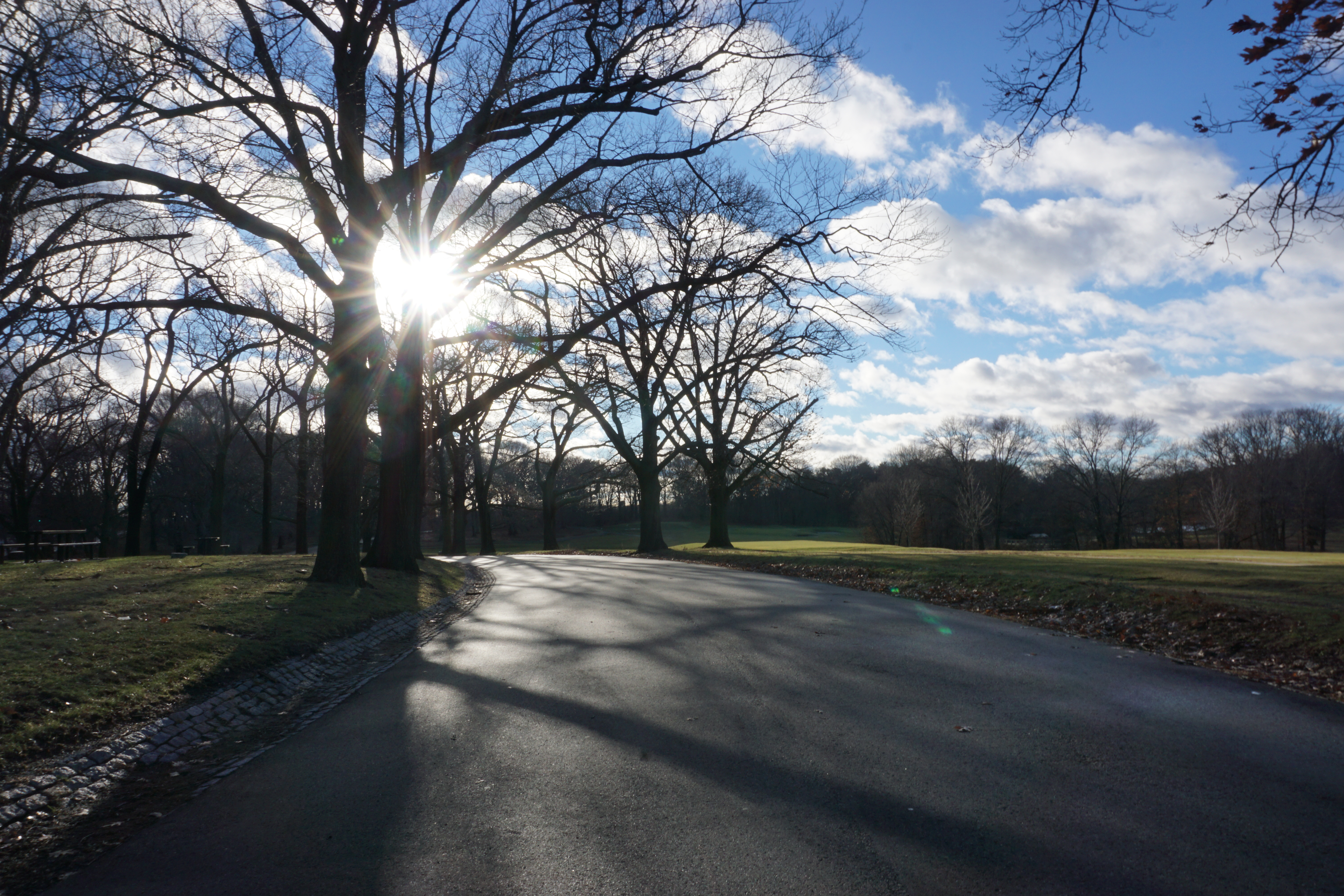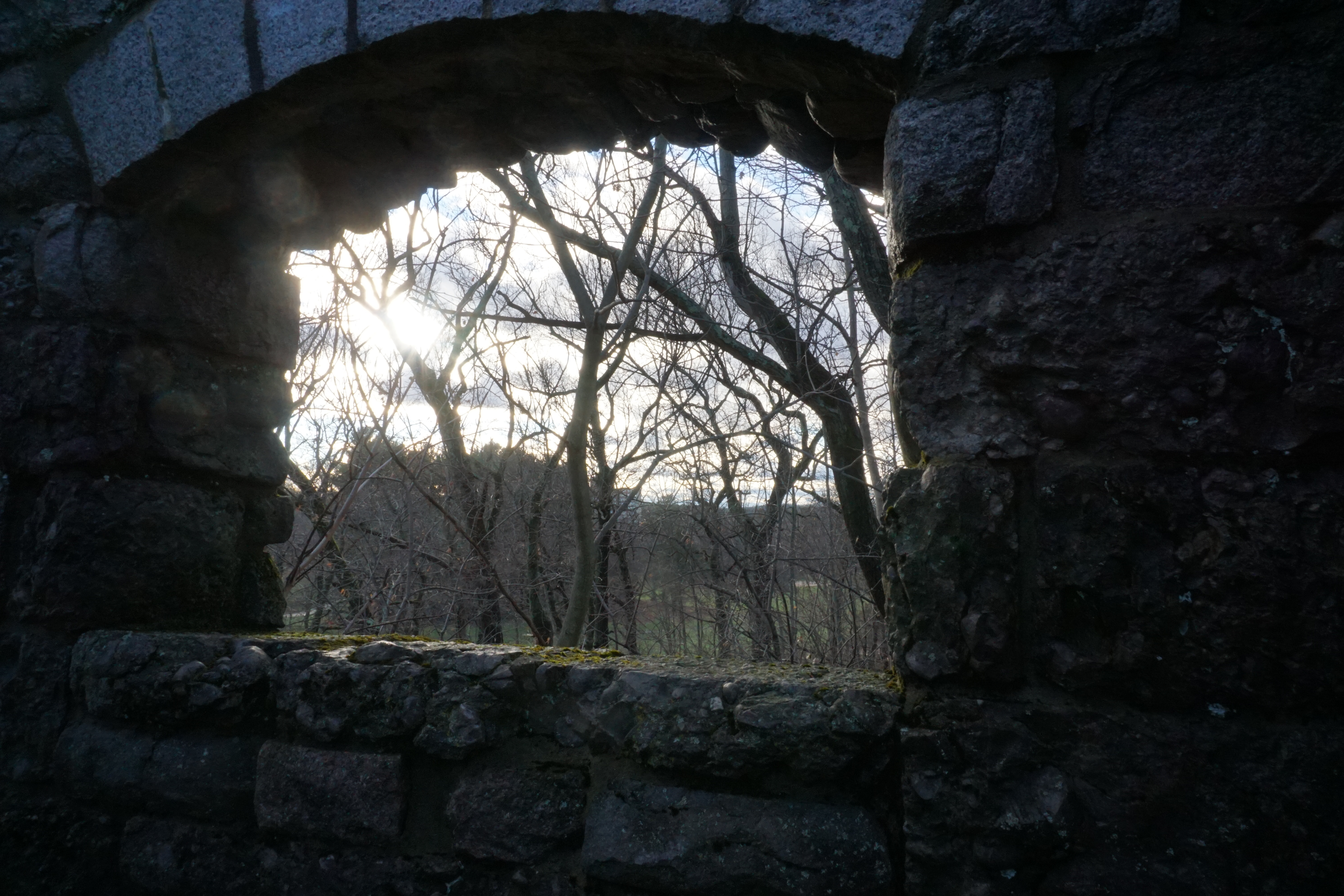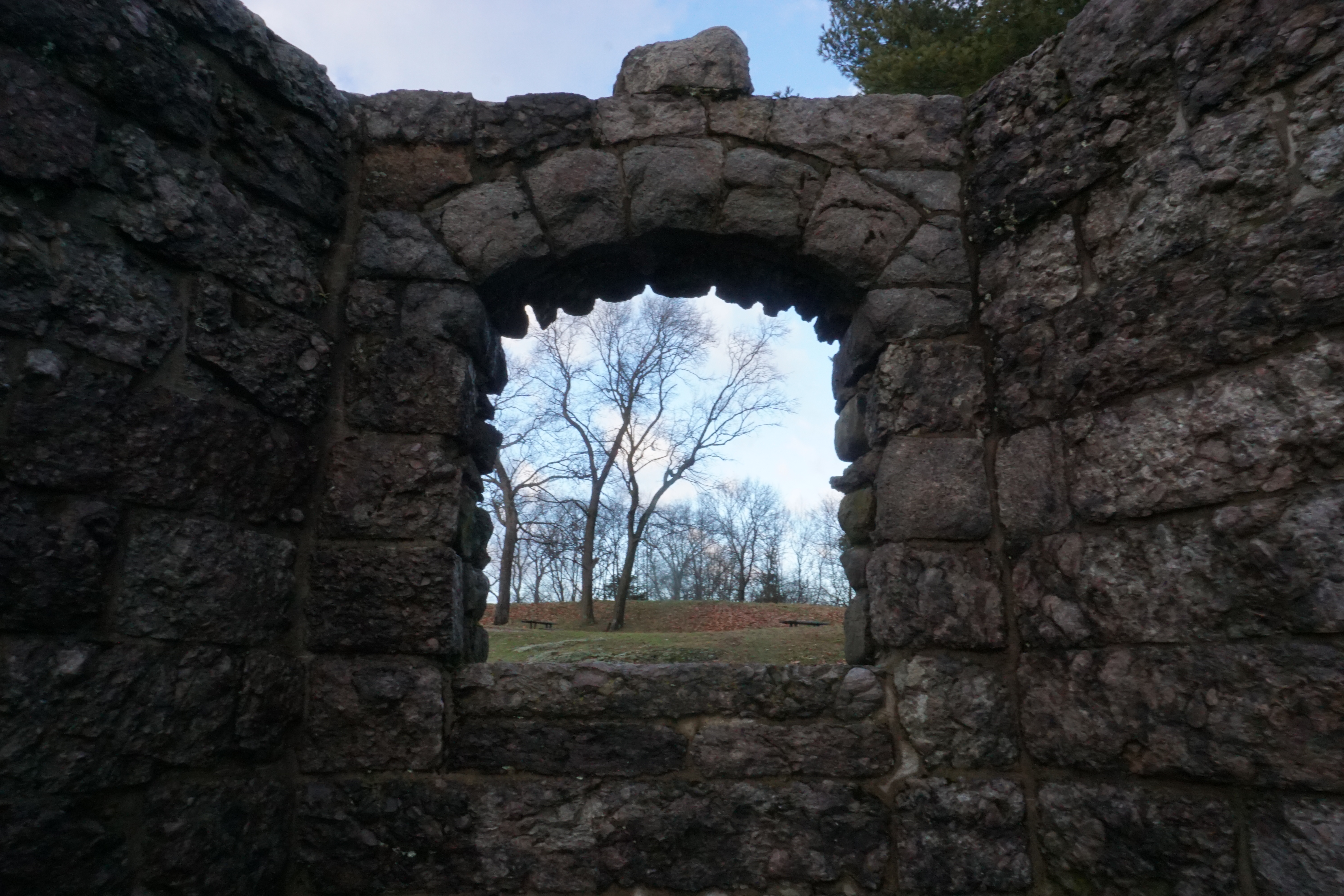 After Scarboro Pond we headed on the main loop around the Park. The Park was centered by the golf course, and the clouds and sun were just right. We passed various things including a playground and cafe before arriving at the Schoolmaster Hill. I was so excited to head up the Hill to check out the ruins. We arrived at the ruins after a short walk up the Hill, trotting through the ruins several times, appreciating each moment of the experience. Wilma appeared extra curious, jumping up, putting her front paws up to look through, and peaking into each corner. I absolutely loved the ruins, they were beautiful. Definitely exceeded my expectations! (Please see below for a video as well as numerous photographs).