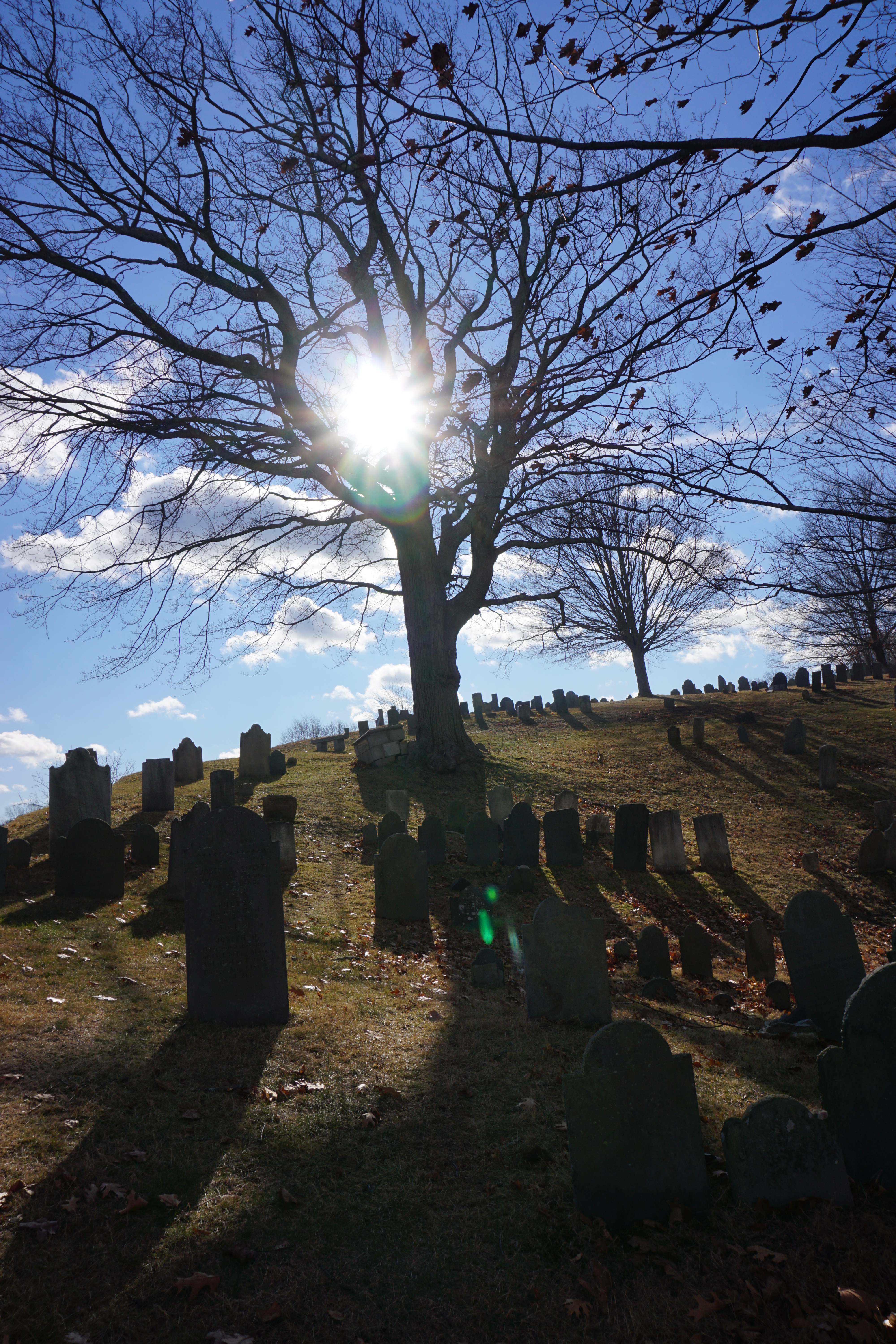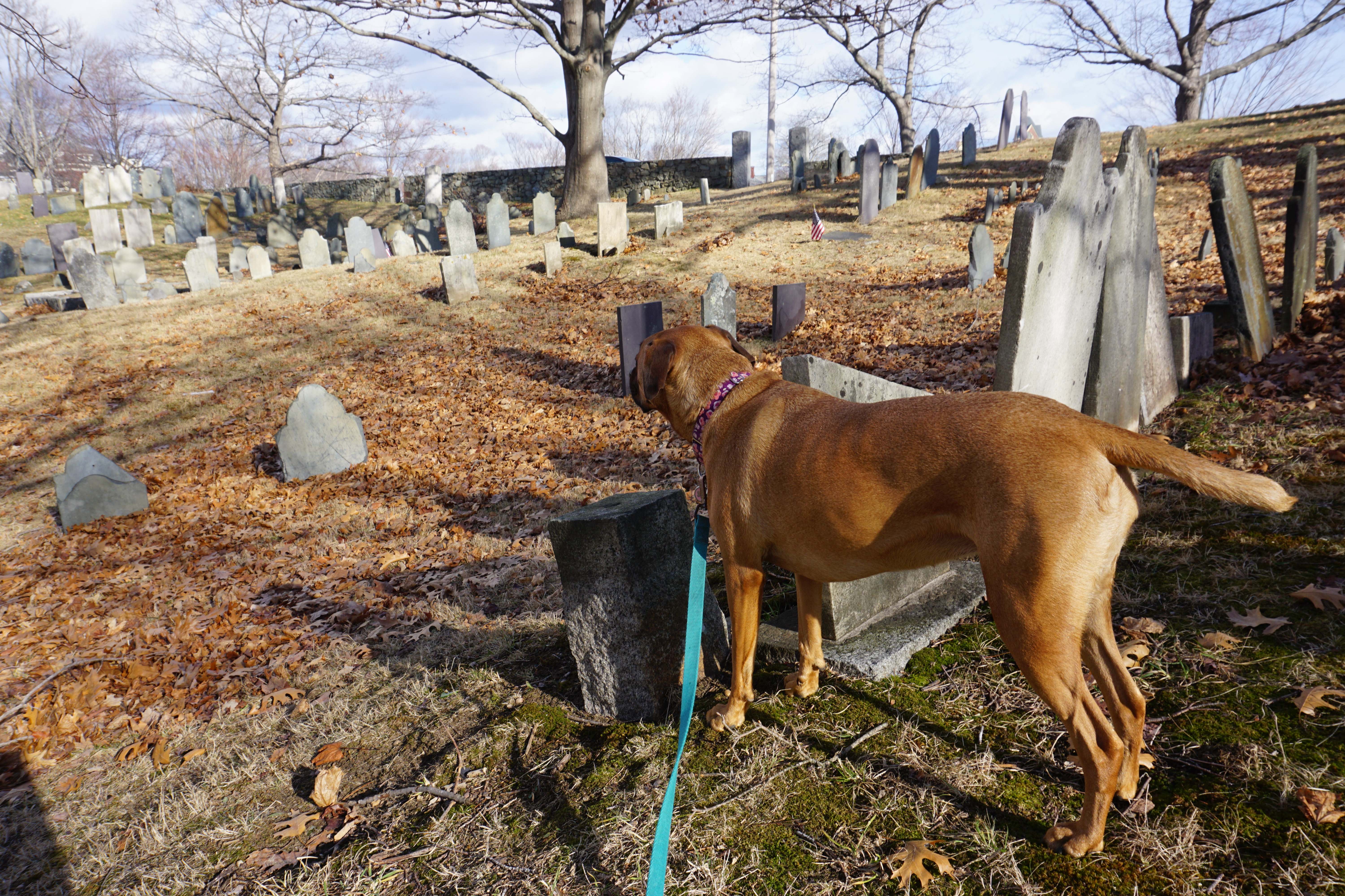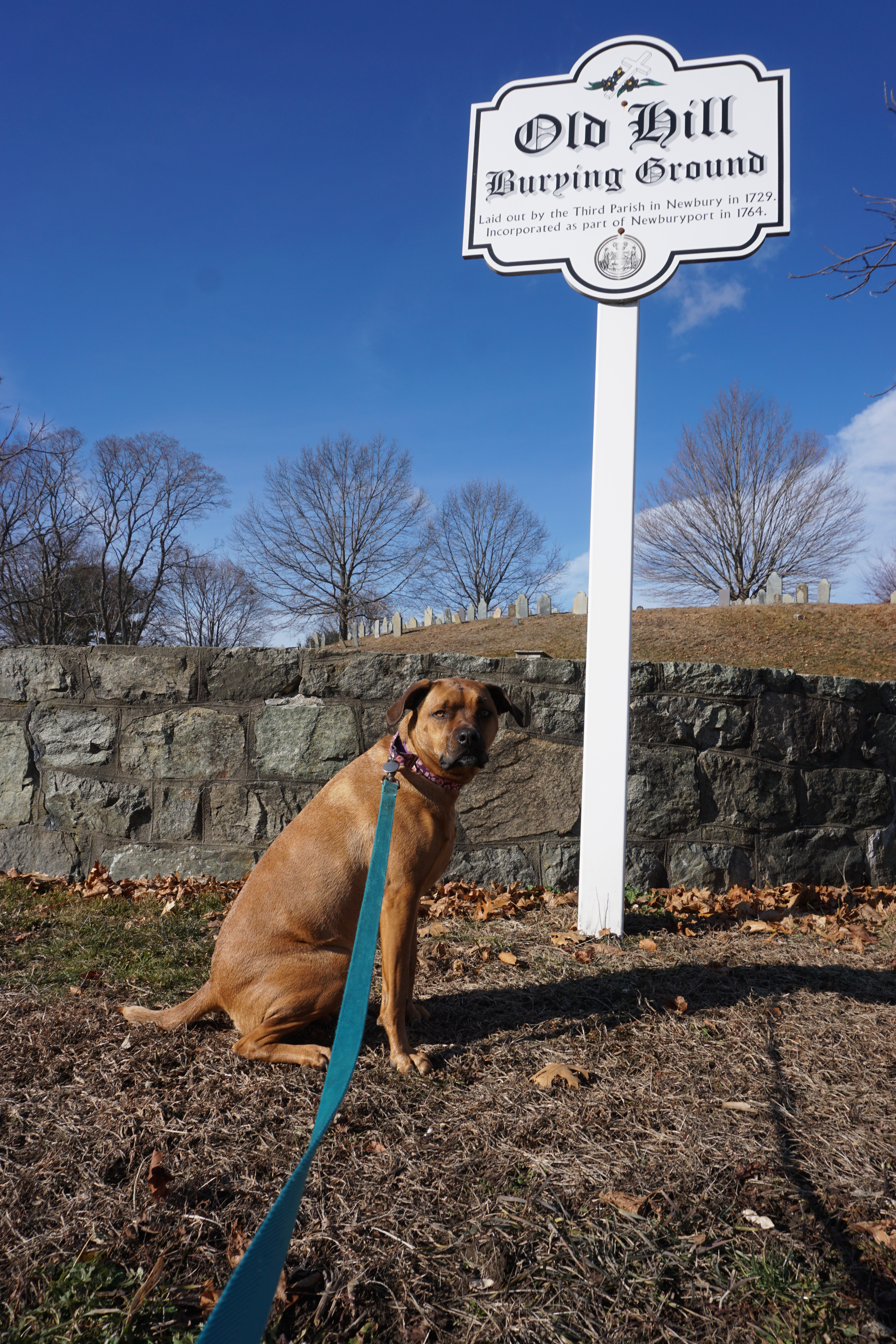 We had a historic Adventure to the Old Hill Burying Ground. We spent about two hours walking around Newburyport and the Clipper Trail, including today’s Adventure to the Old Hill Burying Ground. (Please click on this link if you would like to read more about our last visit to Newburyport – January 1, 2019 – Downtown Newburyport and the Clipper City Rail Trail – Massachusetts). We first walked around the outskirts of the Burying Ground checking out the scene from all angles. It was quite scenic, the sun streaming through the trees, the blue sky full of fluffy cloud. Wilma enjoyed walking along the stone fence. which oddly makes me smile. Once we made our lap around we went into the grounds to explore, including venturing to the top of the hill. I am far from an expert on cemeteries but I found it quite picturesque. So glad we could visit the Old Hill Burying Grounds today (This Adventure will not be rated).