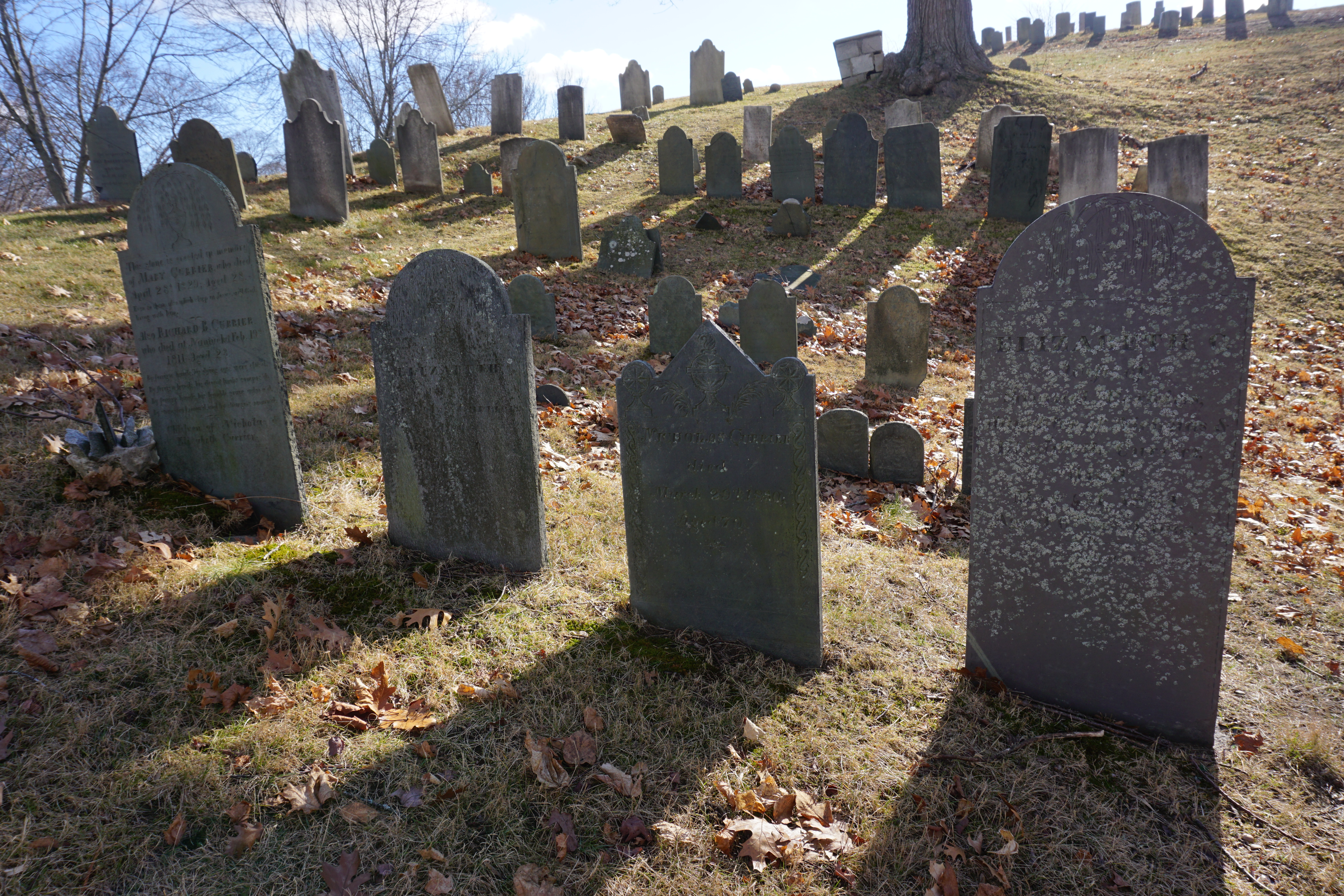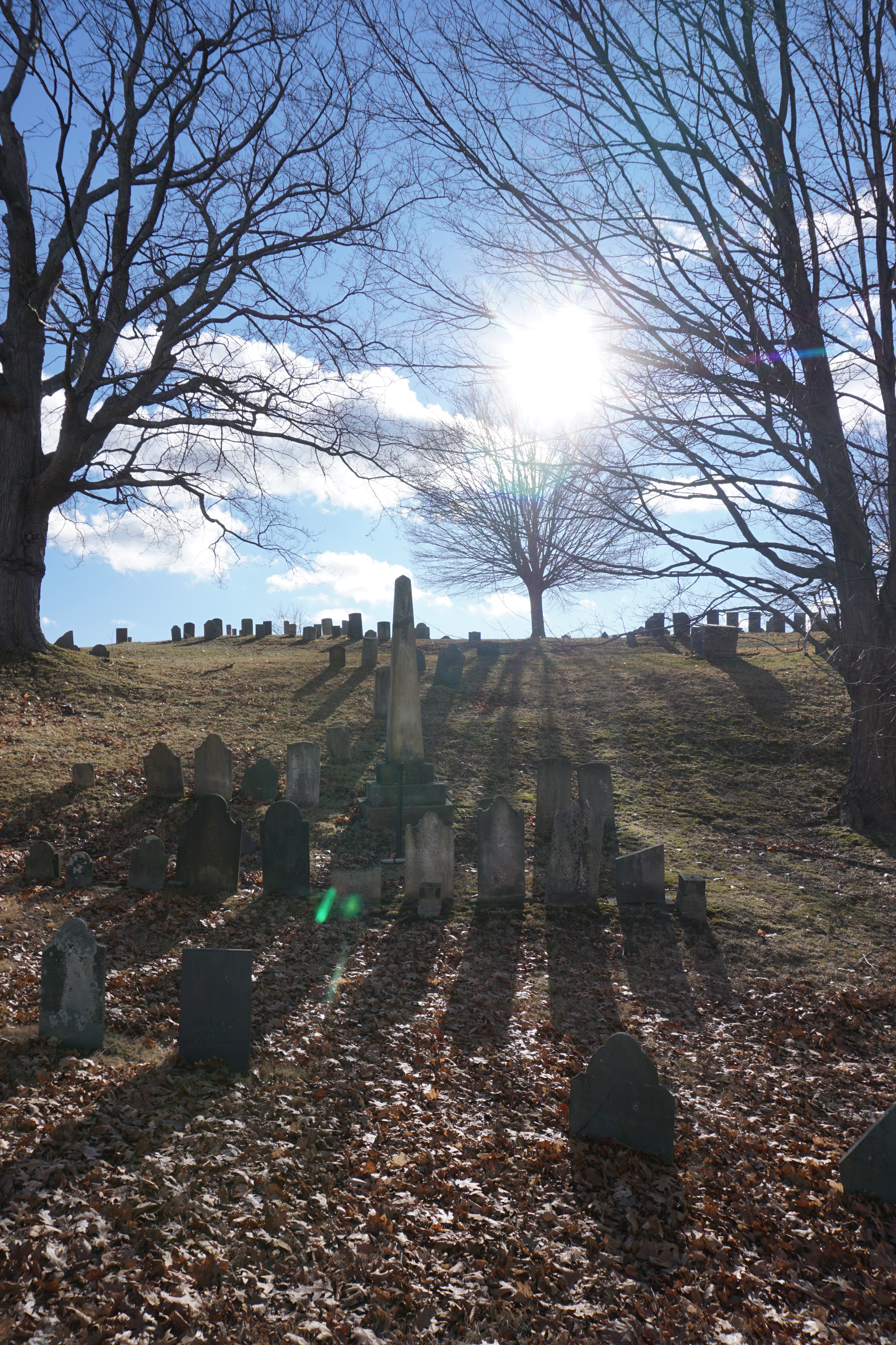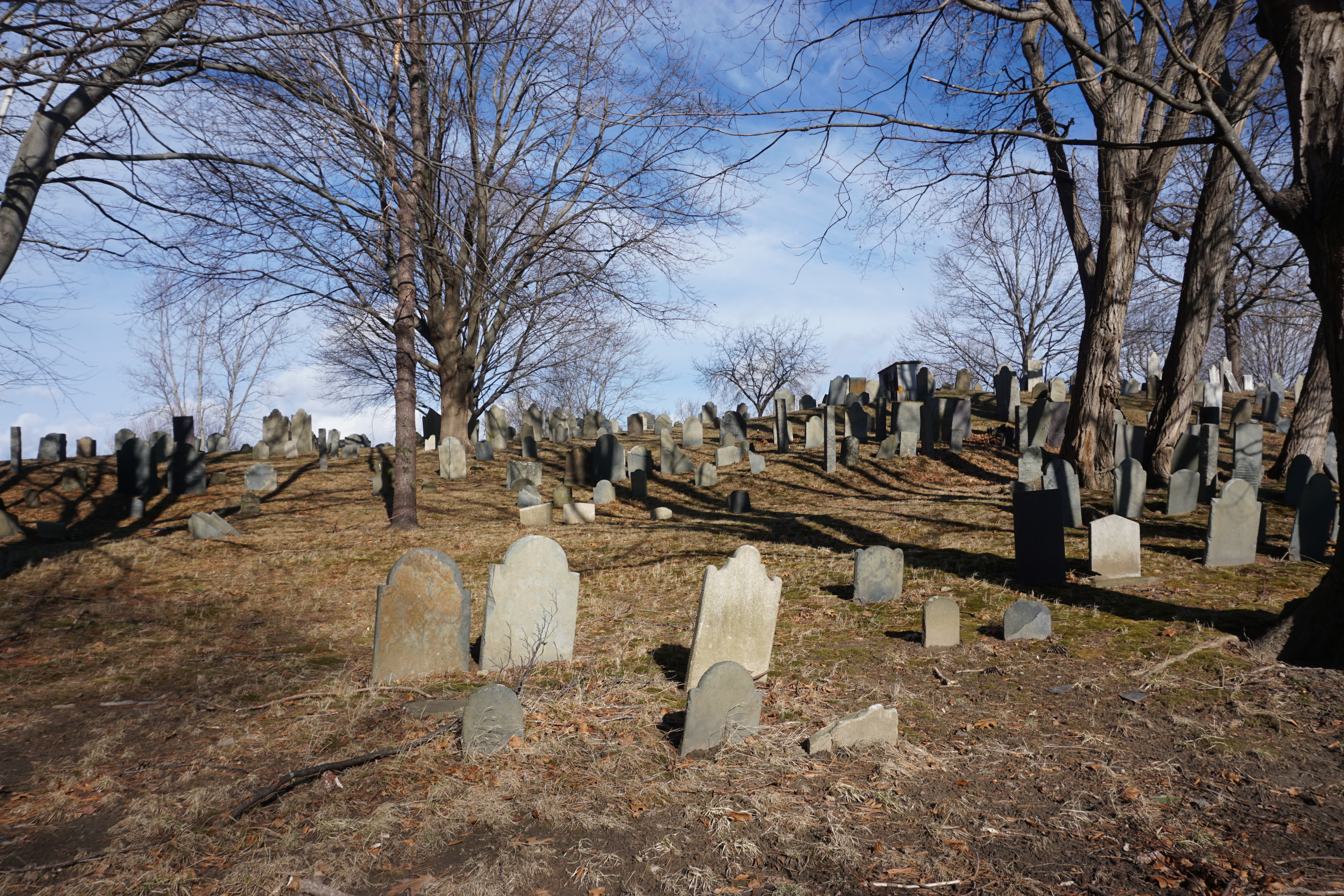 We had a historic Adventure to the Old Hill Burying Ground. We spent about two hours walking around Newburyport and the Clipper Trail, including today’s Adventure to the Old Hill Burying Ground. (Please click on this link if you would like to read more about our last visit to Newburyport – January 1, 2019 – Downtown Newburyport and the Clipper City Rail Trail – Massachusetts). We first walked around the outskirts of the Burying Ground checking out the scene from all angles. It was quite scenic, the sun streaming through the trees, the blue sky full of fluffy cloud. Wilma enjoyed walking along the stone fence. which oddly makes me smile. Once we made our lap around we went into the grounds to explore, including venturing to the top of the hill. I am far from an expert on cemeteries but I found it quite picturesque. So glad we could visit the Old Hill Burying Grounds today (This Adventure will not be rated).