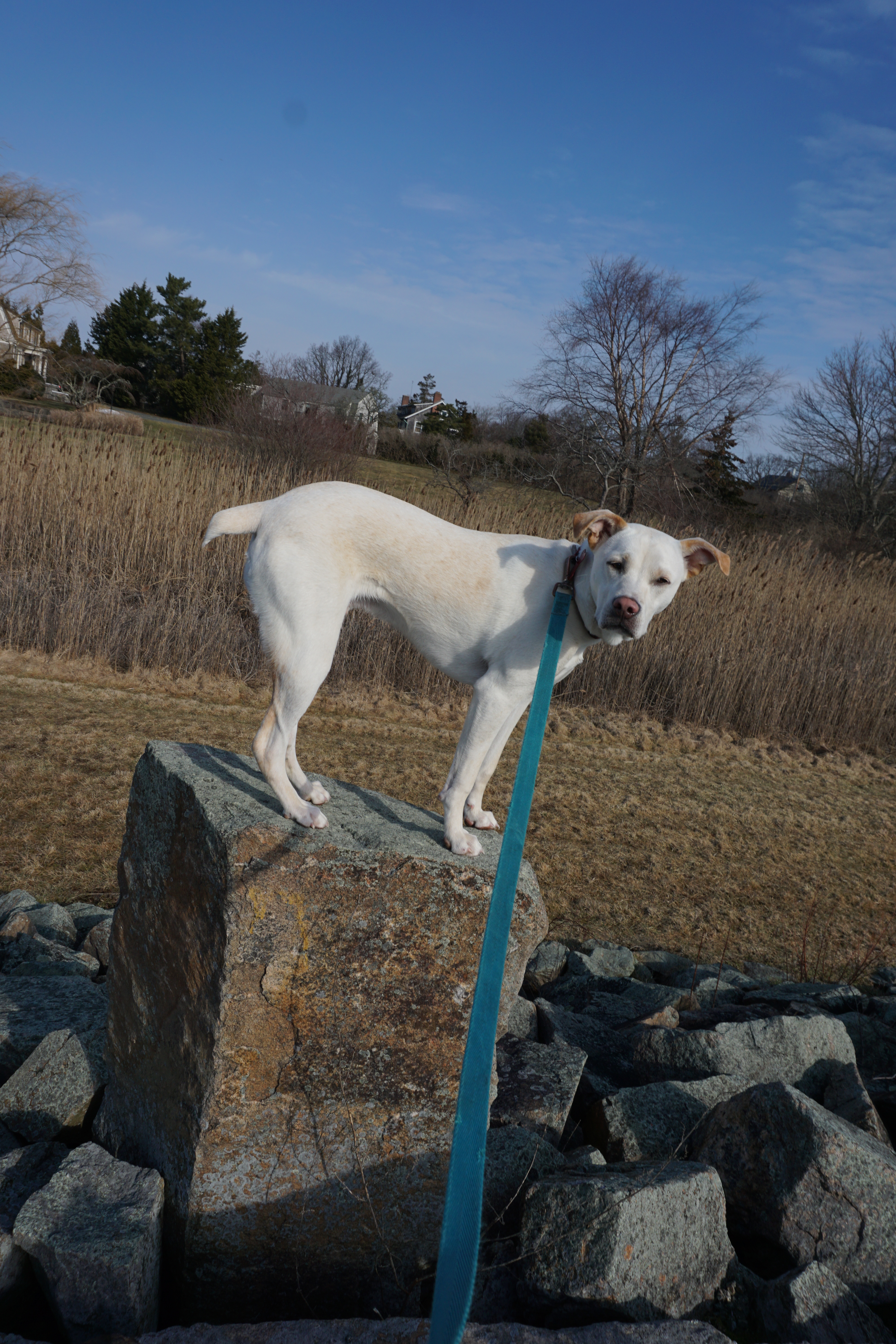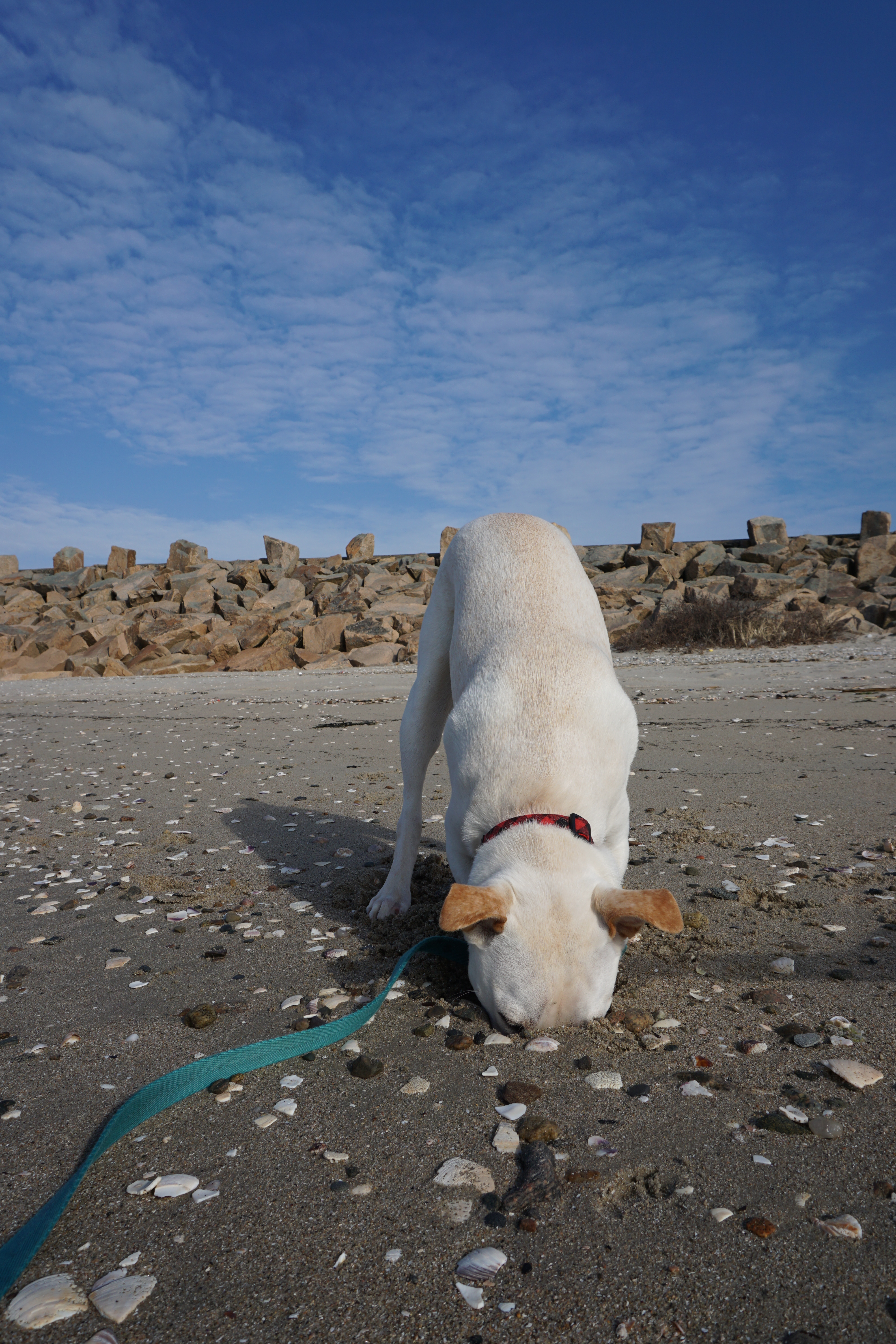 We had a nice Adventure to For Pheonix State Reservation. I had been to this Reservation long ago with Shadow but only took several photos, so this was the first time visiting since I began the blog. I was surprised to find many cars upon arrival, but yet pleased to see little visitors. We first explored the park, walked the hurricane barrier, and spent some time on the beach. It was an unusually warm New England day but yet quite windy on the coast, however not windy enough to be chilly. We loved walking and taking our time exploring. Gus enjoyed some digging, and Wilma was quite happy to see some large rocks for climbing. The park was simple, but uniquely combined a Fort, and the beach. So glad we could visit Fort Pheonix today (Rating: 3).