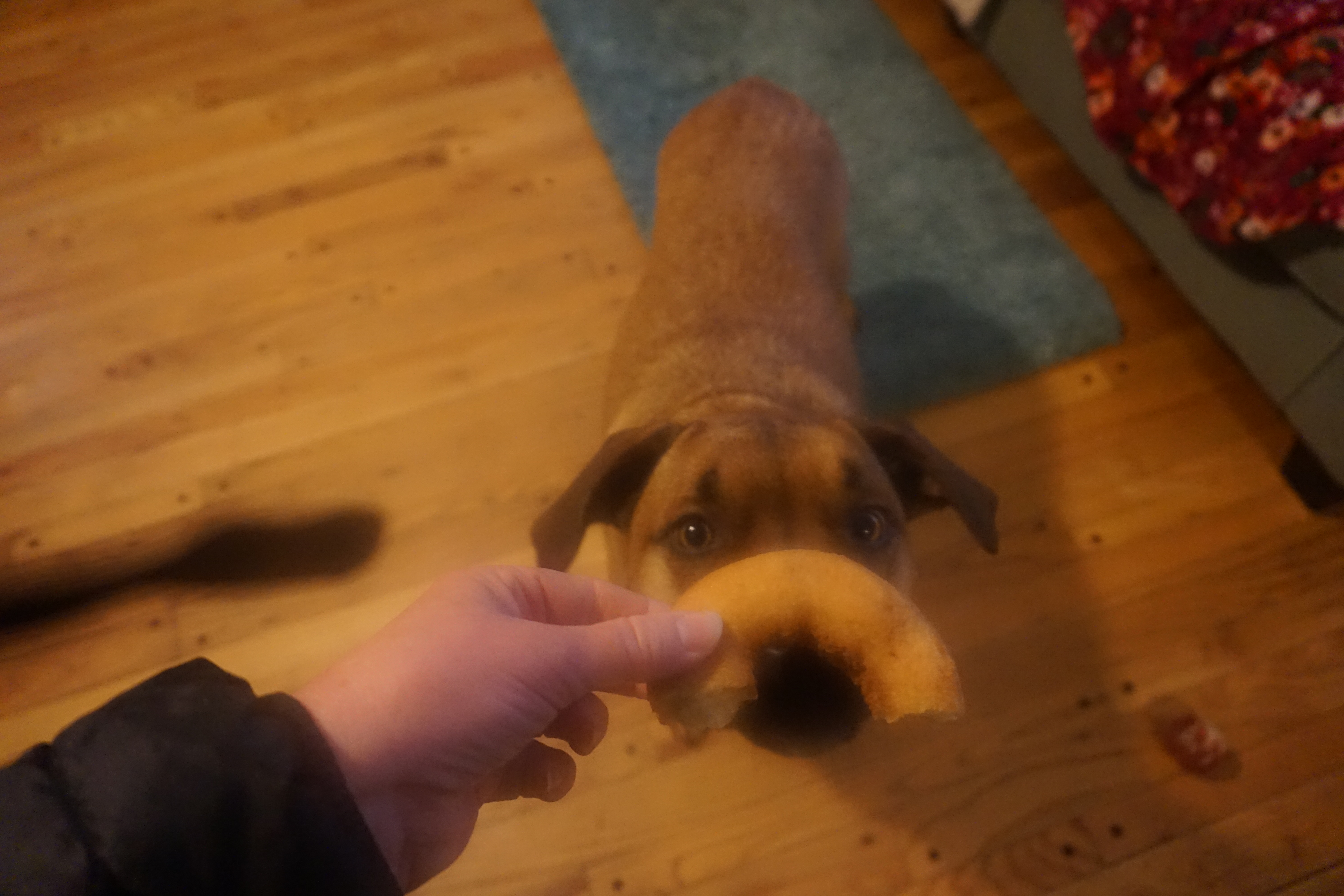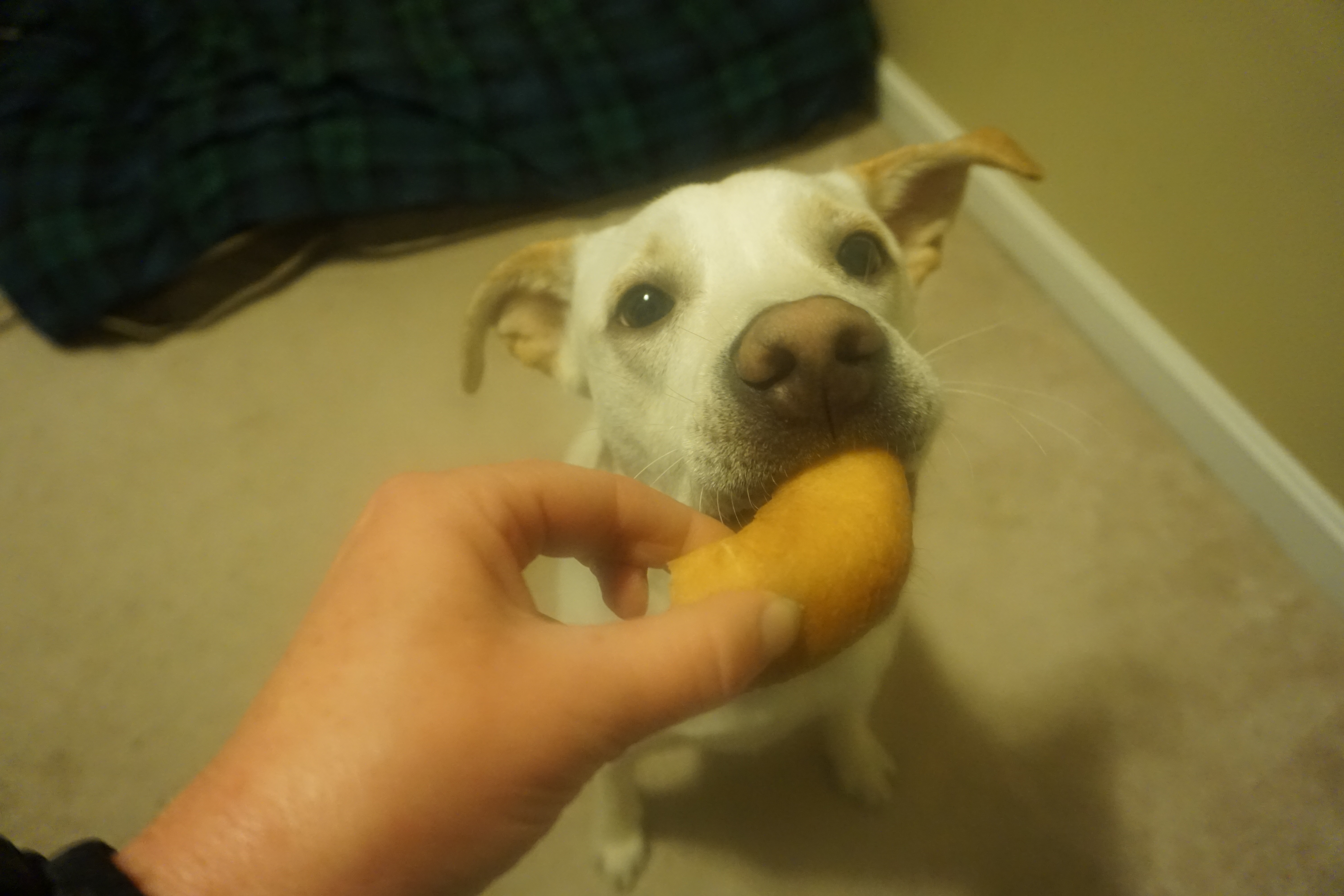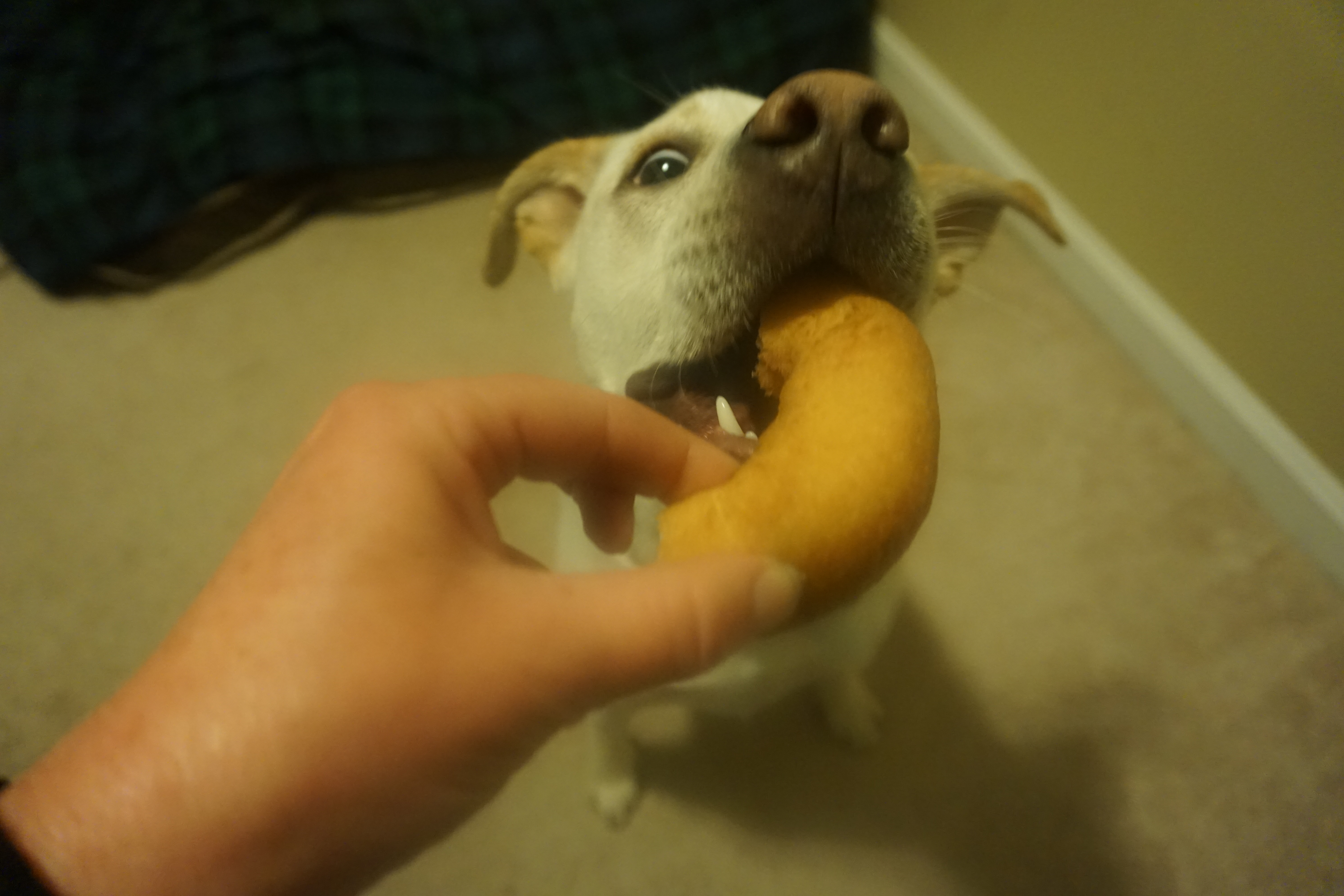 Today Wilma and Gus enjoyed a Dunkin Donuts donut! Unfortunately I have a slight addiction to Dunkin Donuts coffee. On occasion while ordering through the drive thru they offer the pups a donut. On our visit today they actually provided us two in a bag, so I took this treats home for them to enjoy. Honestly, I only gave them each half as it really does not seem like they need to be eating an entire donut. However they were more than pleased and Gus took some time trying to figure out how to best devour this unique treat.
