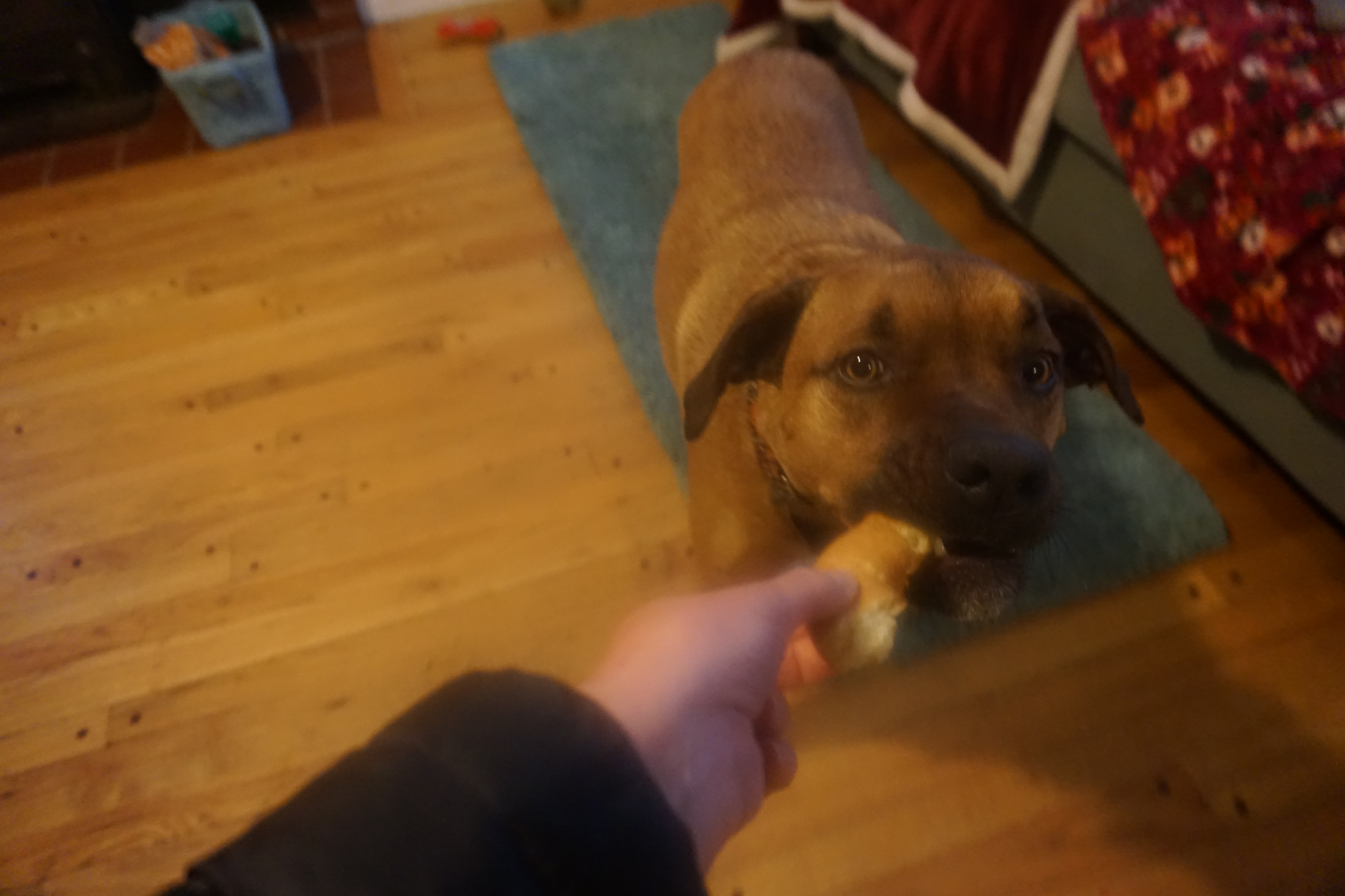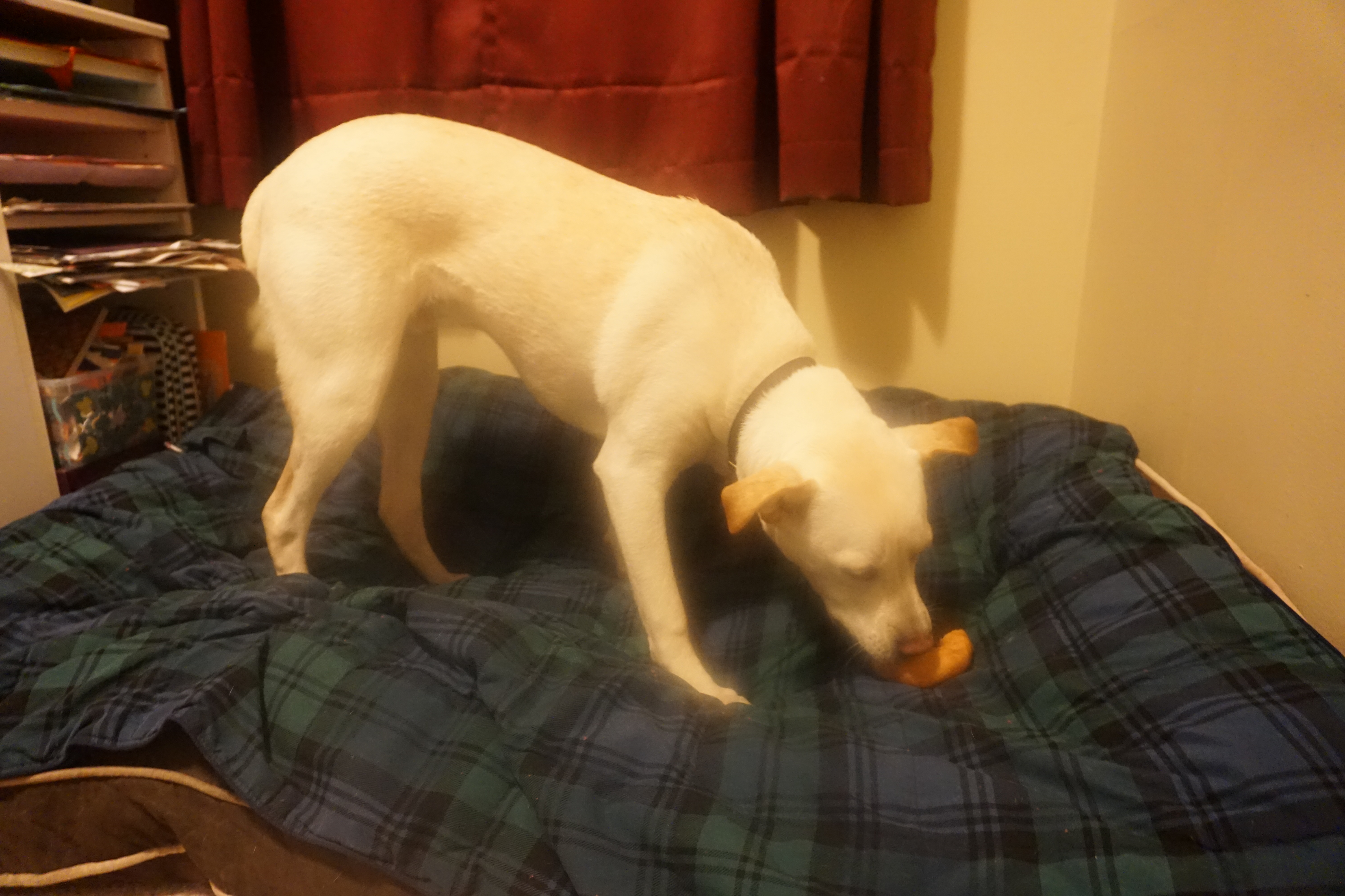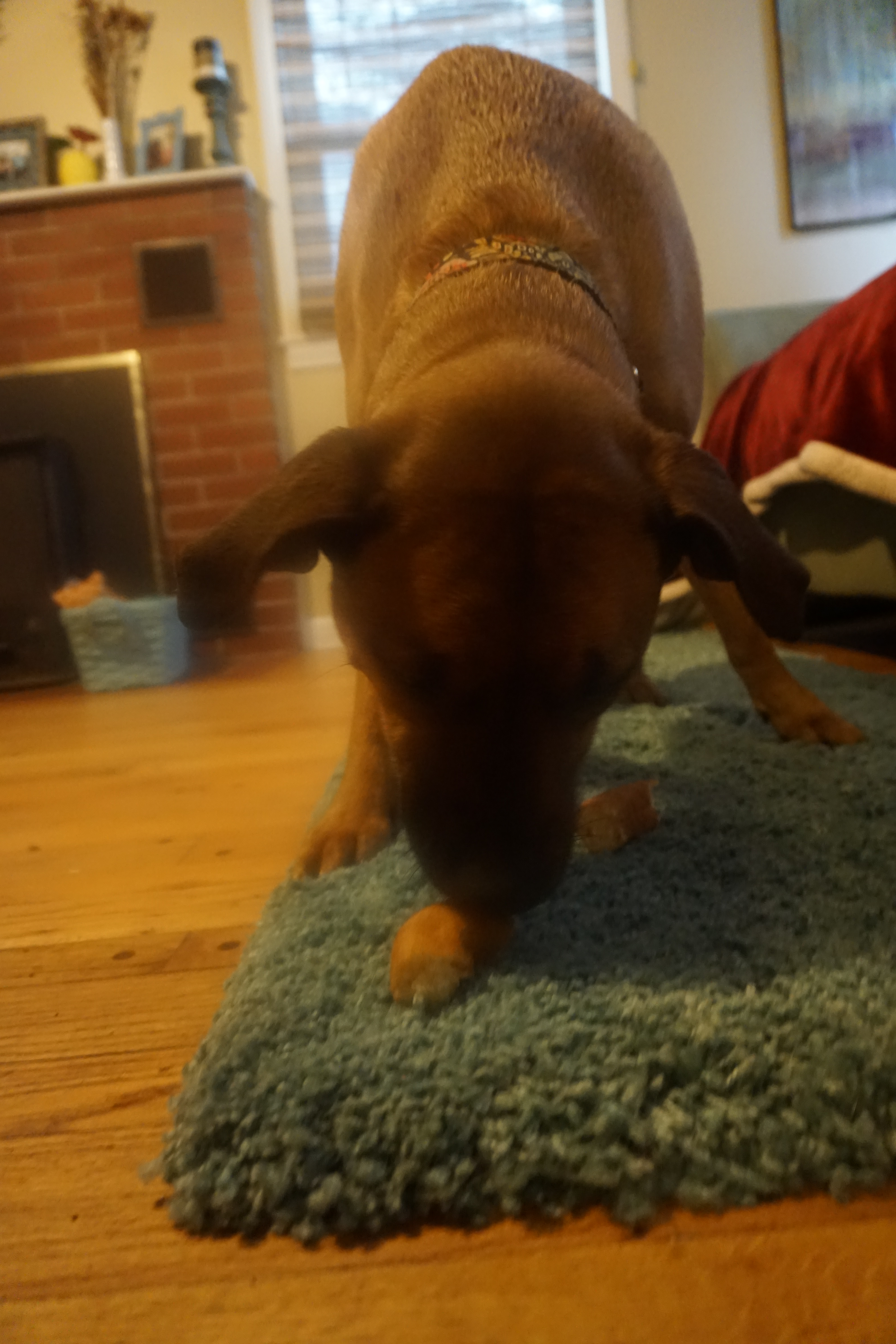Today Wilma and Gus enjoyed a Dunkin Donuts donut! Unfortunately I have a slight addiction to Dunkin Donuts coffee. On occasion while ordering through the drive thru they offer the pups a donut. On our visit today they actually provided us two in a bag, so I took this treats home for them to enjoy. Honestly, I only gave them each half as it really does not seem like they need to be eating an entire donut. However they were more than pleased and Gus took some time trying to figure out how to best devour this unique treat.