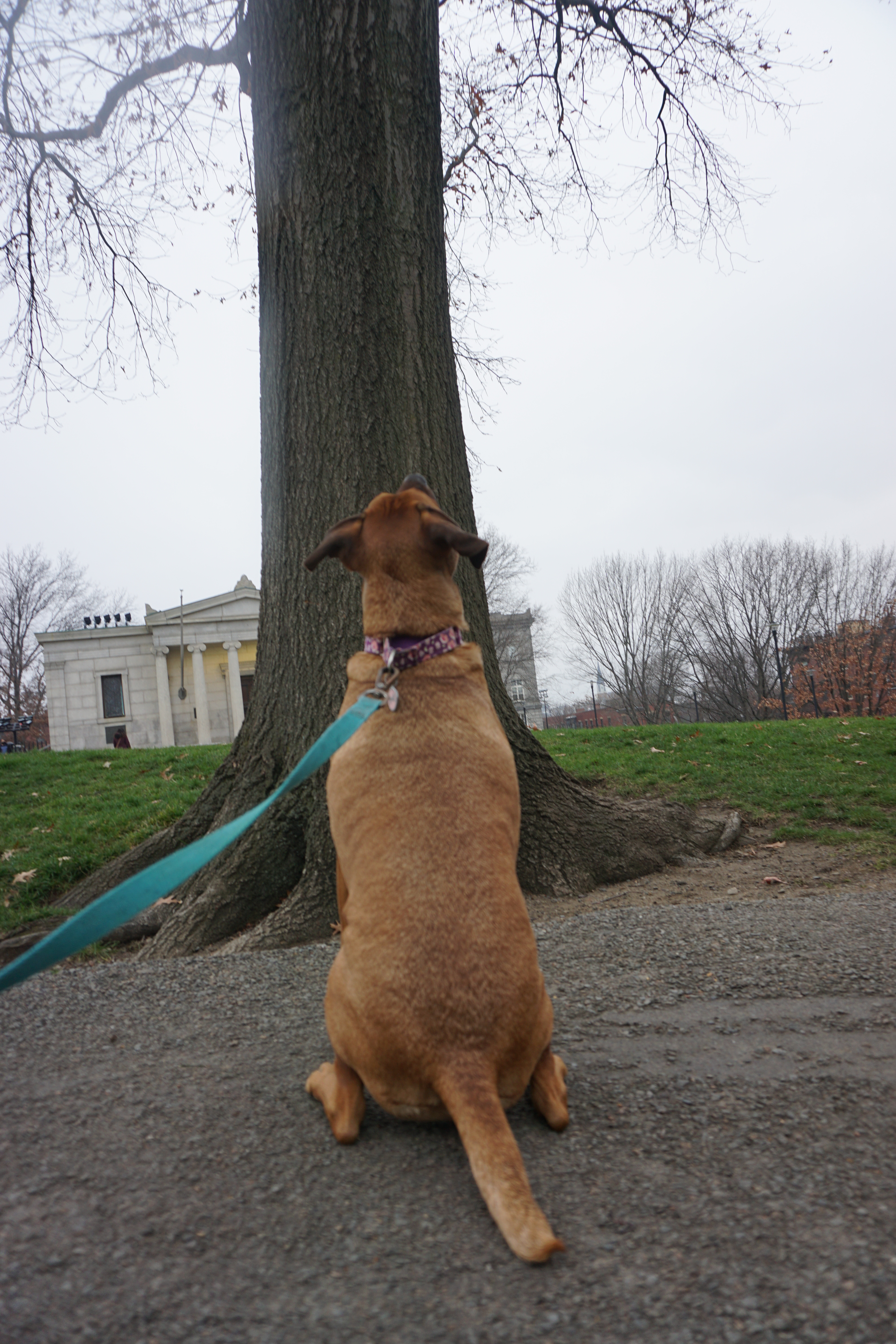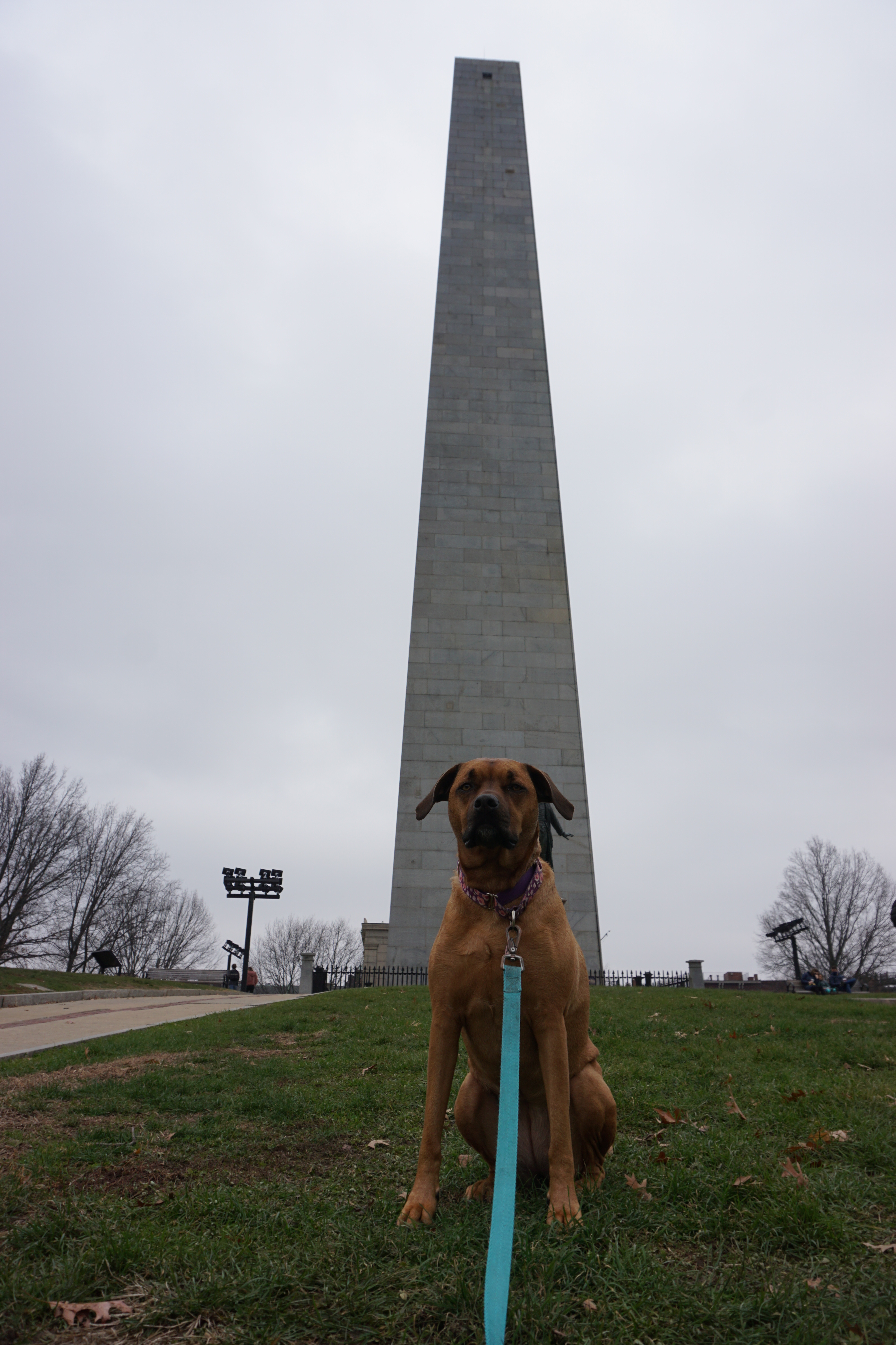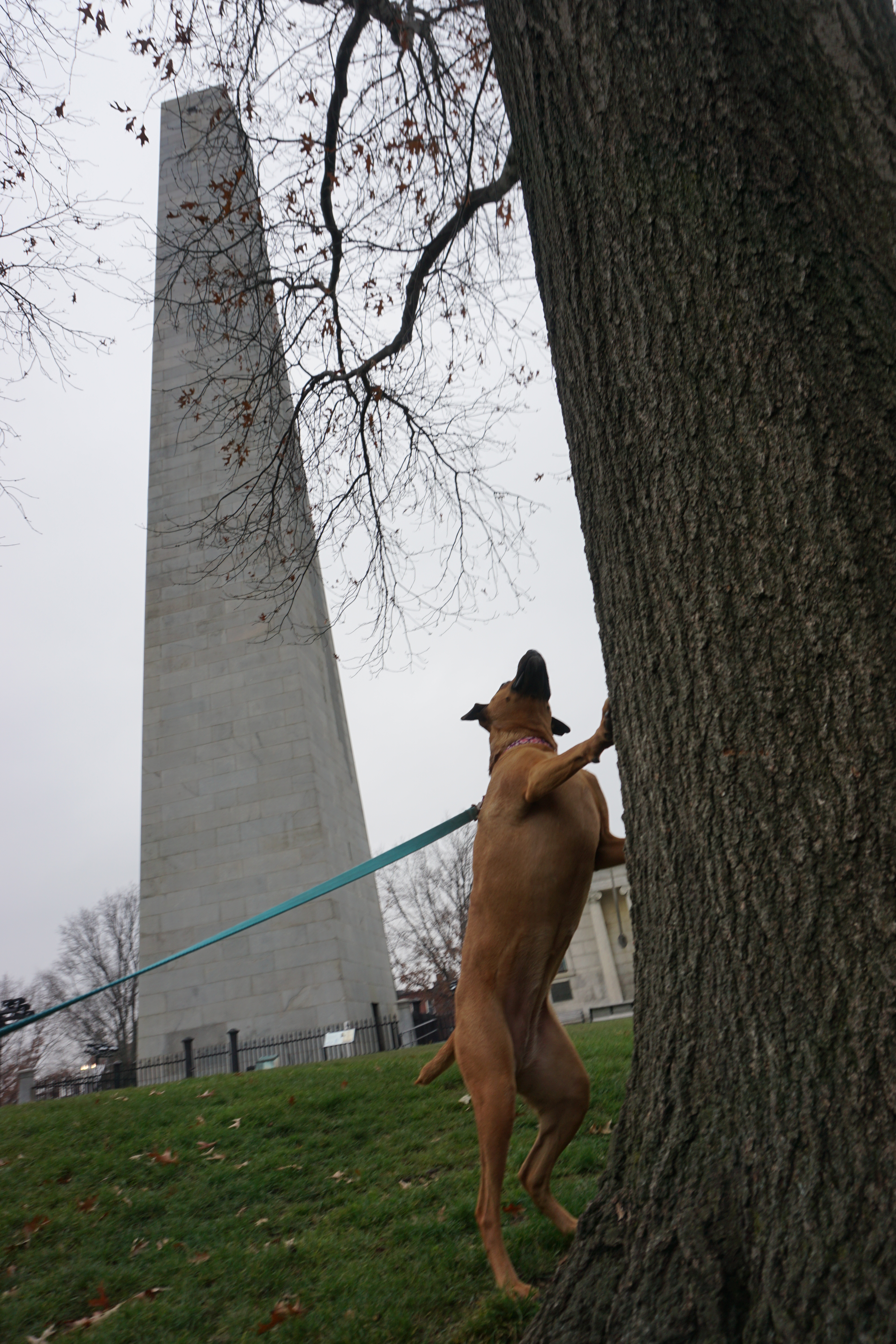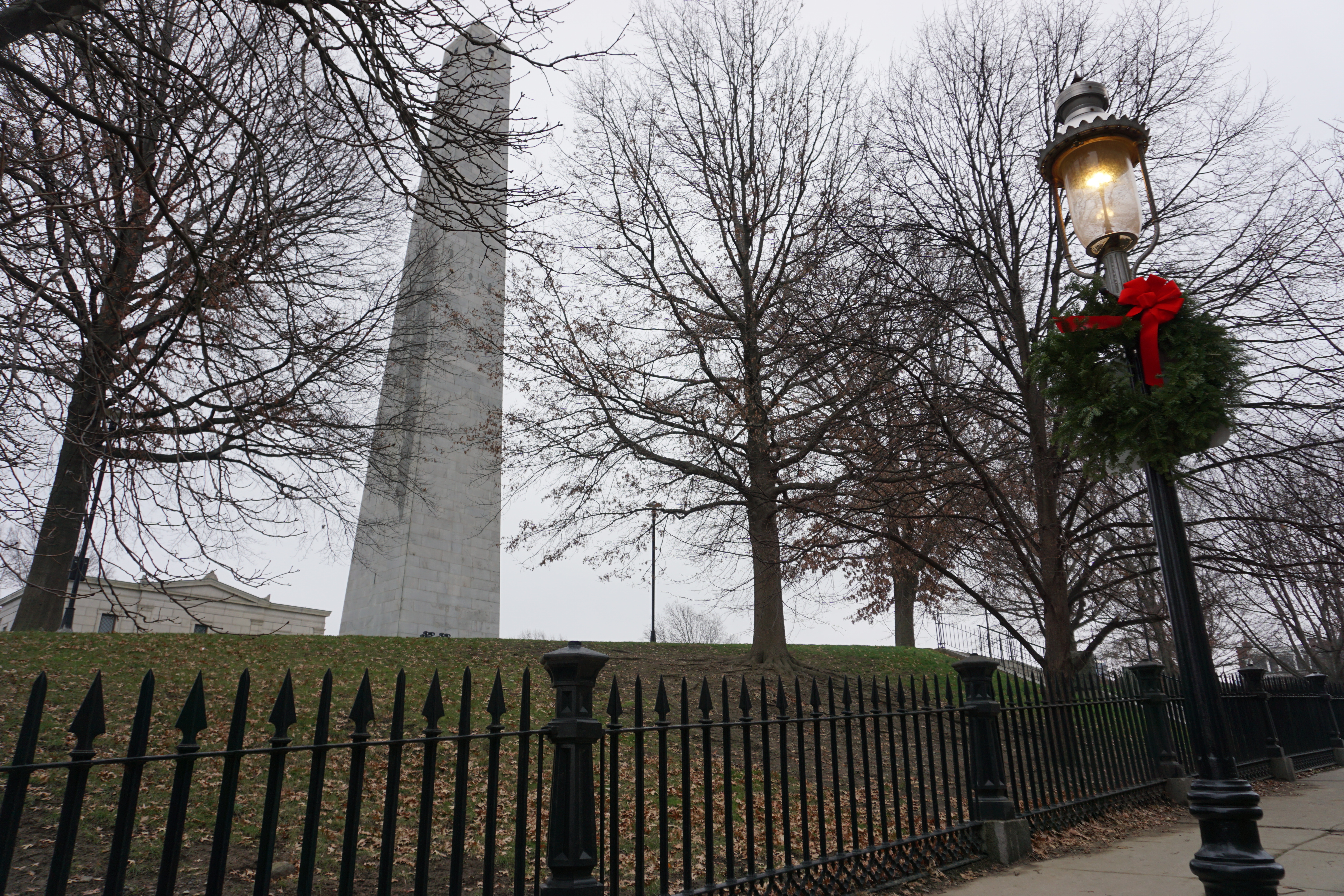 We had a dark Adventure to the Bunker Hill after a long walk at one of our favorite local parks. Upon arrival I immediately spotted lovely holiday wreaths adoring the lights around the park. We immediately headed up the hill to the Monument. There was an outer loop that we began trotting along, Wilma thrilled to spot numerous city squirrels. We took our time checking out the grounds and appreciating the moment. In between the neighborhood buildings we could spot views of the city, and bridges, hard to capture on camera but a beautiful perk to this simple park.