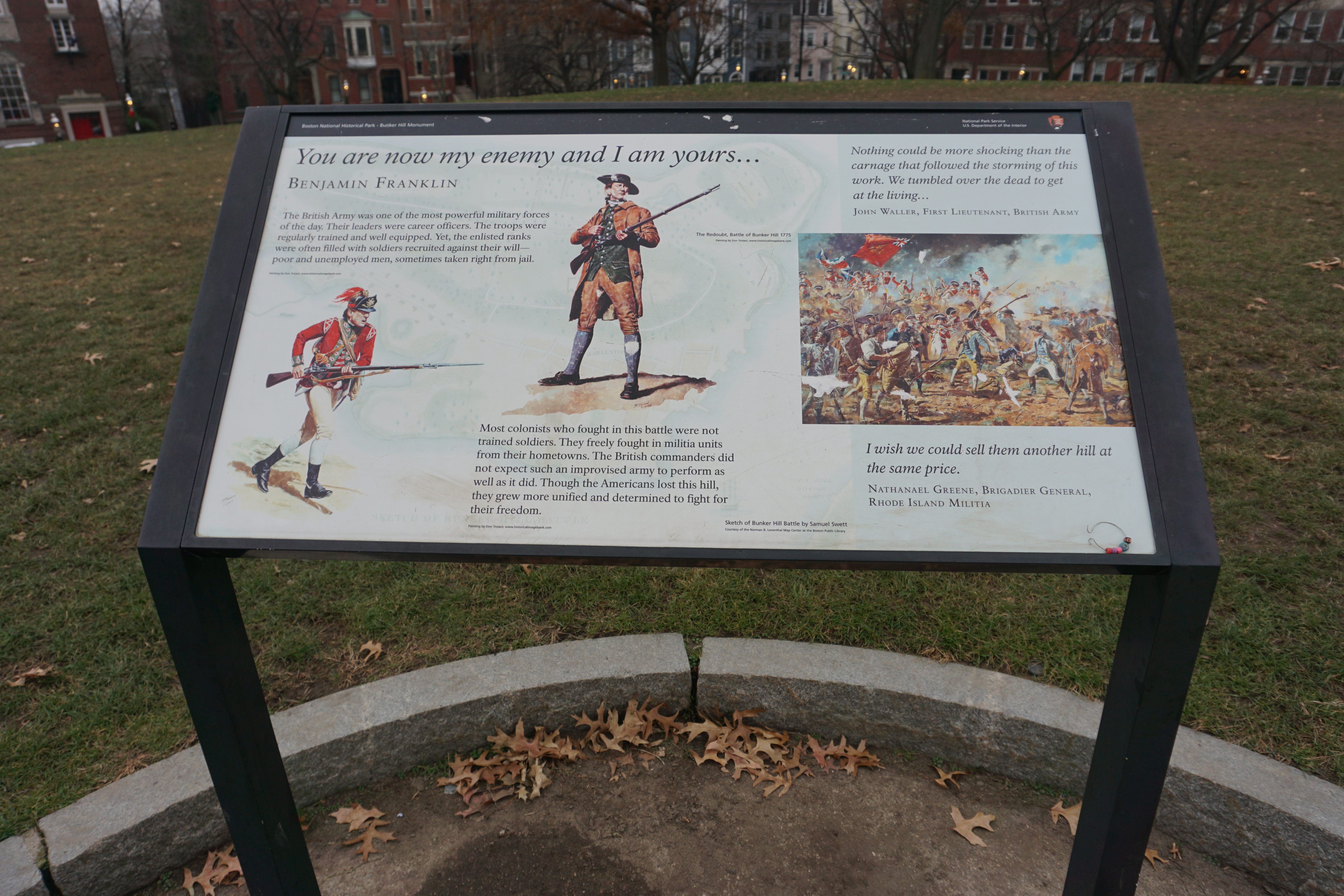 Today Wilma and I Adventured to the Bunker Hill in Charlestown, Massachusetts. Bunker Hill includes the Monument, the statue of Colonial William Prescott, the Museum (located across the street), and the Lodge. The Bunker Hill Monument was created to remember the Battle of Bunker Hill during the Revolutionary War. The Battle occurred on June 17, 1775 when the British defeated the Americans.