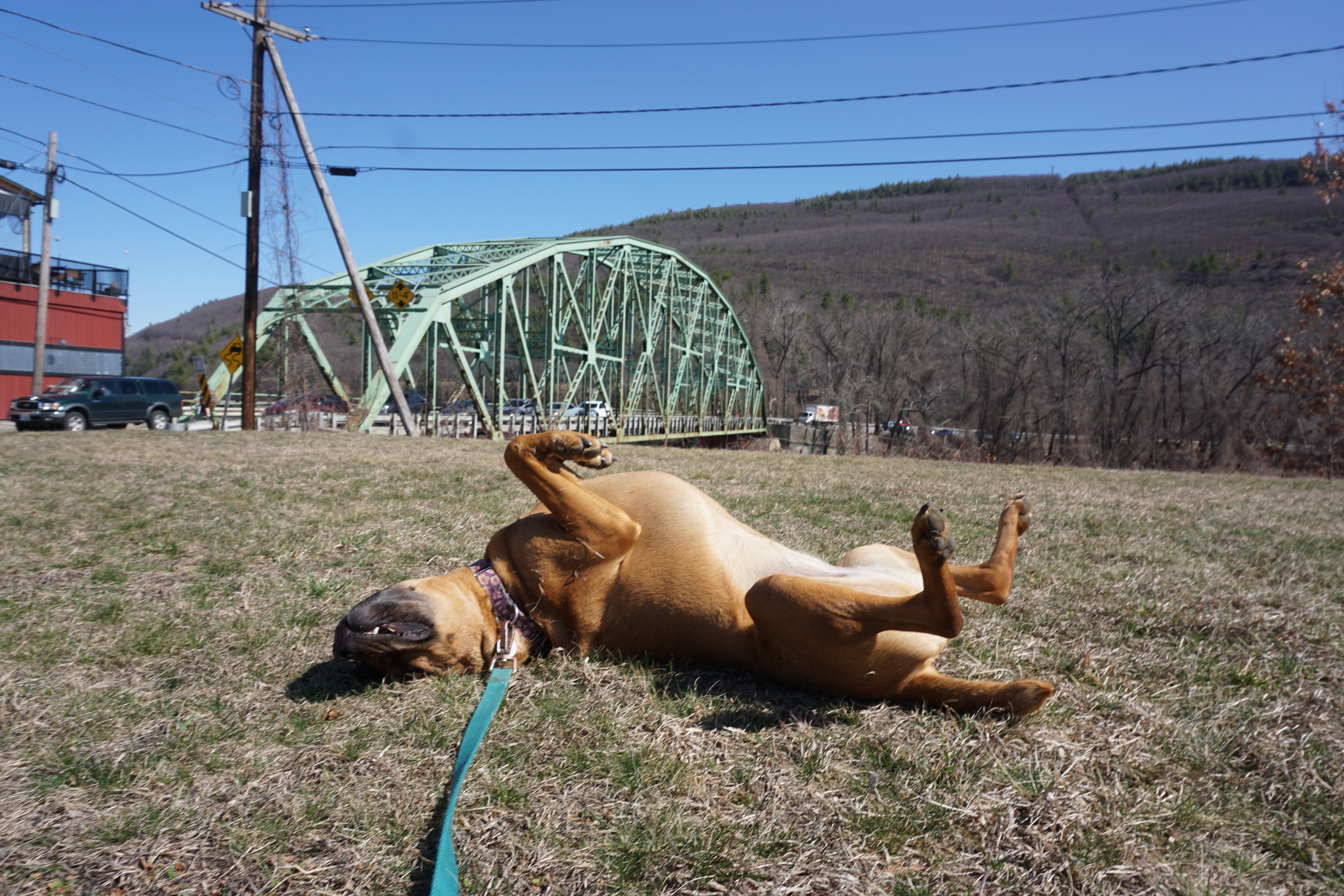 We had a simple Adventure to Ferry Landing State Park, one of our four adventure today. I did not expect much, reading the reviews, however it was even smaller than I imagined. We arrived to find a nice breeze, several ladies painting, and few other visitors. We trotted around and enjoyed views of the water and bridges from across the river. Both Wilma and Gus seemed eager to explore, and of course Wilma celebrated this new adventure with some happy rolls. Our Adventure ended quickly and unexpectantly when a commuter rail loudly crashed across the bridge sending Gus into a panic. Luckily it went by quickly, but he could not calm himself, until he jumped into the car. Thankfully that appeared to instantly bring him back to a feeling of safety. Such a bummer of a moment for this sweet guy, however no ongoing issues as he enjoyed our next location as if the moment had not occurred. So glad we could check out this simple little park today (Rating: 3).